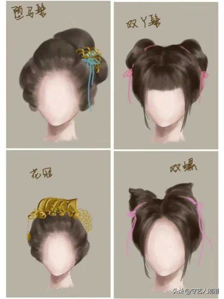 双丫髻:双丫髻是双挂式中最常见之发式,其梳编法是将发平分两侧,再梳结成髻,置于头顶两侧。前额外负担多饰有垂发,俗称刘海,一般多用于侍婢丫环。双挂髻其梳编法是将发从头顶平分两股。结成髻或鬟,垂挂于两侧,额前饰有垂发。