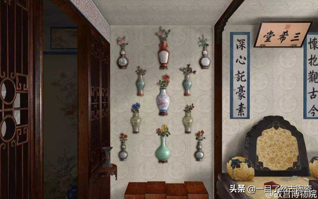 壁瓶其实是一个小众的瓷器器型,但器型和工艺却很丰富多样,几乎常规的瓷器器型都可以做成壁瓶,工艺也与常规瓷器一样丰富、精美。这些小巧的壁瓶在皇家,主要是被放置在空间狭小的地方。最著名的一景,就是养心殿西暖阁三希堂的东墙上,集中挂满了精美的壁瓶,非常有视觉冲击,令人过目不忘,牢记了“壁瓶”的存在。