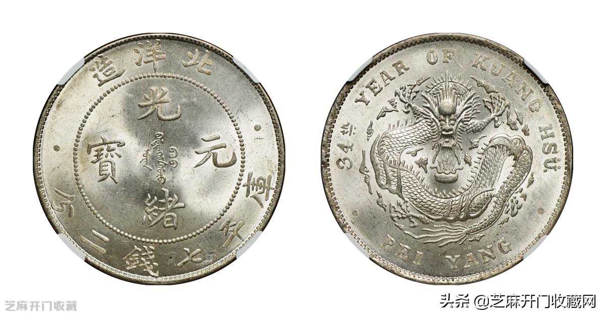 2:北洋造光绪34年七钱二分普通NGCMS66,估价:RMB80000,成交价格:RMB322000