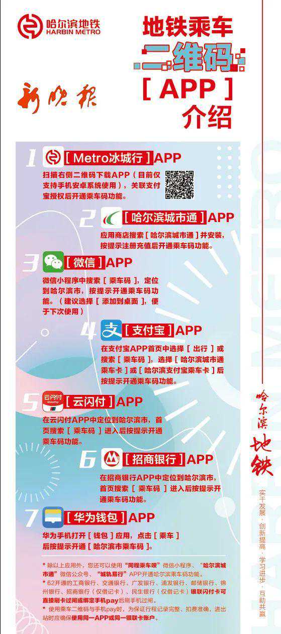 乘车二维码:目前,乘客可在地铁使用的乘车二维码官方APP为“哈尔滨城市通”APP和“METRO冰城行”APP,可使用第三方APP包括微信“乘车码”小程序、微信“哈尔滨城市通”公众号、微信“同程乘车呗”小程序、支付宝“哈尔滨支付宝乘车卡”、支付宝“哈尔滨城市通乘车卡”、云闪付APP、招商银行APP、华为钱包APP。另外,已加入中国城市轨道交通行业协会“城轨易行”平台的外地地铁官方APP也可生成哈尔滨地铁乘车码。使用乘车二维码时,进出站均为将二维码对准闸机扫码读头后通过。为保证行程记录完整、扣费准确,进出站时应确保使用同一APP下的同一种乘车码。