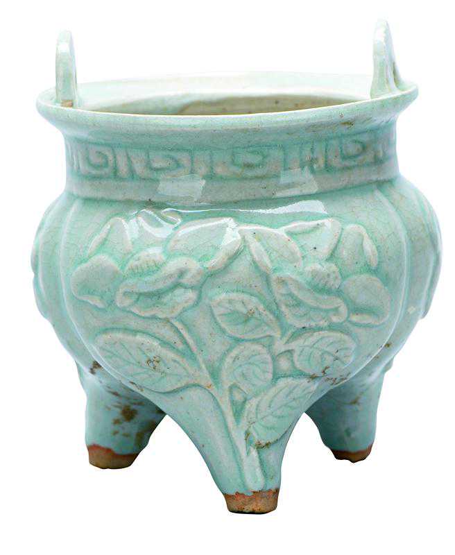 图14南宋景德镇窑青白釉凸雕花卉纹鬲式炉(一级文物)