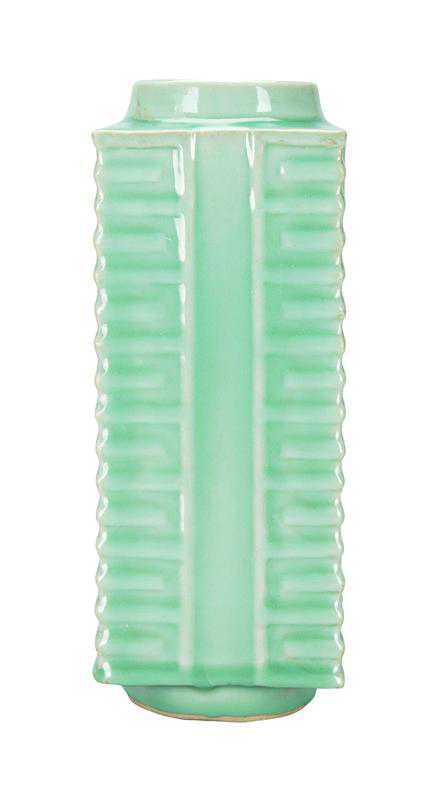 泥片围接法成型。圆唇,直口略斜,短颈。瓶体为长方形,四壁模印四组相同的凸条纹,每组均由8节长短线条相间的条纹组成。圈足较厚。白胎,除圈足底部以外通体内外施梅子青釉,釉层不太均匀,条纹凸起处釉色稍淡,足部积釉最厚,釉色莹润。圈足未施釉处呈褐红色,圈足内侧有一处窑渣粘连。整器较为厚重,似有使用痕迹。