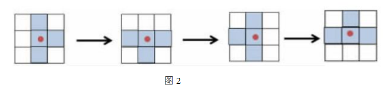 生:我们可以先把头朝上放进去,再向下移动一格,这样一共有两种放法(图3)。然后转一下,头朝向左边,也有两种放法。这样转下去,“T”字型四连方一共有2×4=8种放法。