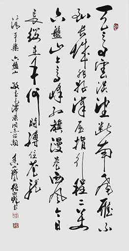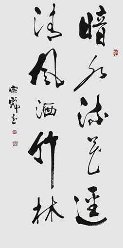 能创新行草的碑质写法,必然要对行草体貌原质有精湛把握。他的行草笔法,先是取法魏晋尚韵的潇洒自如,以二王章草劲拔的书风为格调内核,法师正宗。然后探索唐草笔意,对张旭草法的孤蓬自振大有汲取,对怀素草法的铁画银钩也全面探究,笔法再师唐草,在运行笔墨显观动逸、塑造劲感两个方面皆得翰墨真诀,打下了书法笔墨运行无阻的坚实基础。依正宗基础而施变法,行草参意魏碑就拥有水到渠成毫不违和的自如境界。