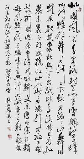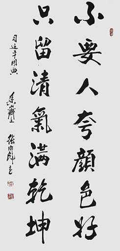 他的行草用笔以老辣苍劲为主体,但是细处常见神来笔妙。初看看劲卓,细看赏端祥,越看越有滋味,久观入神,所以是笔墨的神品级!书如其人,张宗彪书法的浑然大气,除了碑帖相融的笔墨原因之外,还在于他拥有胸襟磅礴的修为。书法能扛鼎,品格最服人!唯有大修为,才成大手笔。张宗彪的书法磨砺碑帖,是取法为上的选择,可以他并不是仅得其中的下落一阶,而是得法亦为上乘的非凡造诣,显然是因为拥有师于古法而不拘泥的笔墨视界,更是因为拥有柳公权心正则笔正的千古境界!行草参魏碑,沉着而不失优雅,恣睢逍遥,仍旧是狂旭癫素的风神传承,放手写心,心笔全一,苍茫雄浑,正大气象!