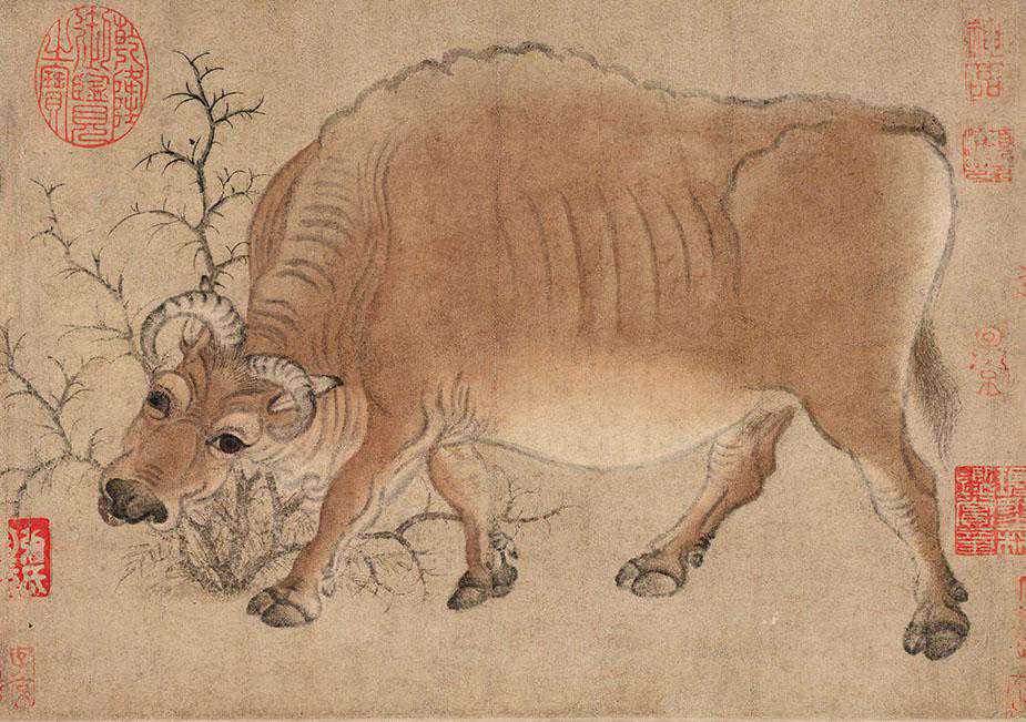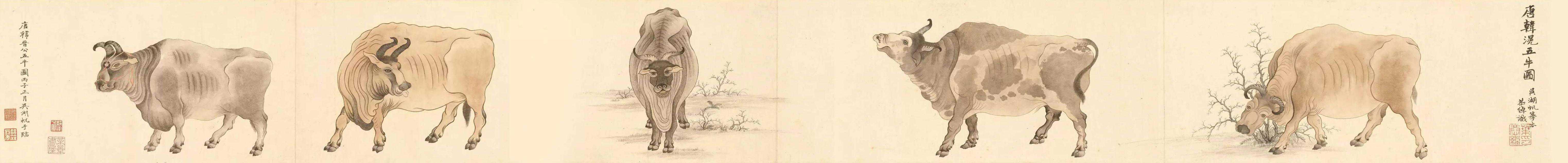 《五牛图》纸本设色,纵20.8cm,横139.8cm,现藏于北宫故宫博物院
