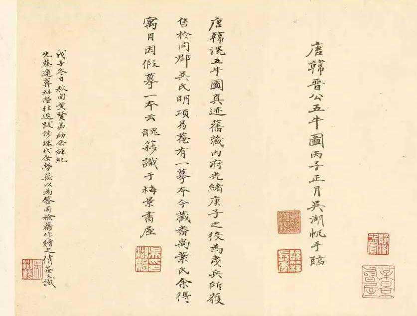 小四曾经写过一篇《乾隆啊乾隆!你差点盖废了十大国宝名画之一的《五牛图》啊!》,重点的介绍了现藏于北宫故宫博物院我国十大国宝名画之一的《五牛图》,这幅《五牛图》卷不仅让我们一睹1300年前唐代画家韩滉画牛的高超技艺,也是目前所见最早作于纸上的中国画。就在十天前左右,在杭州西泠拍卖吴湖帆《摹韩滉五牛图》以26,450,000(含佣金)的价格成交!