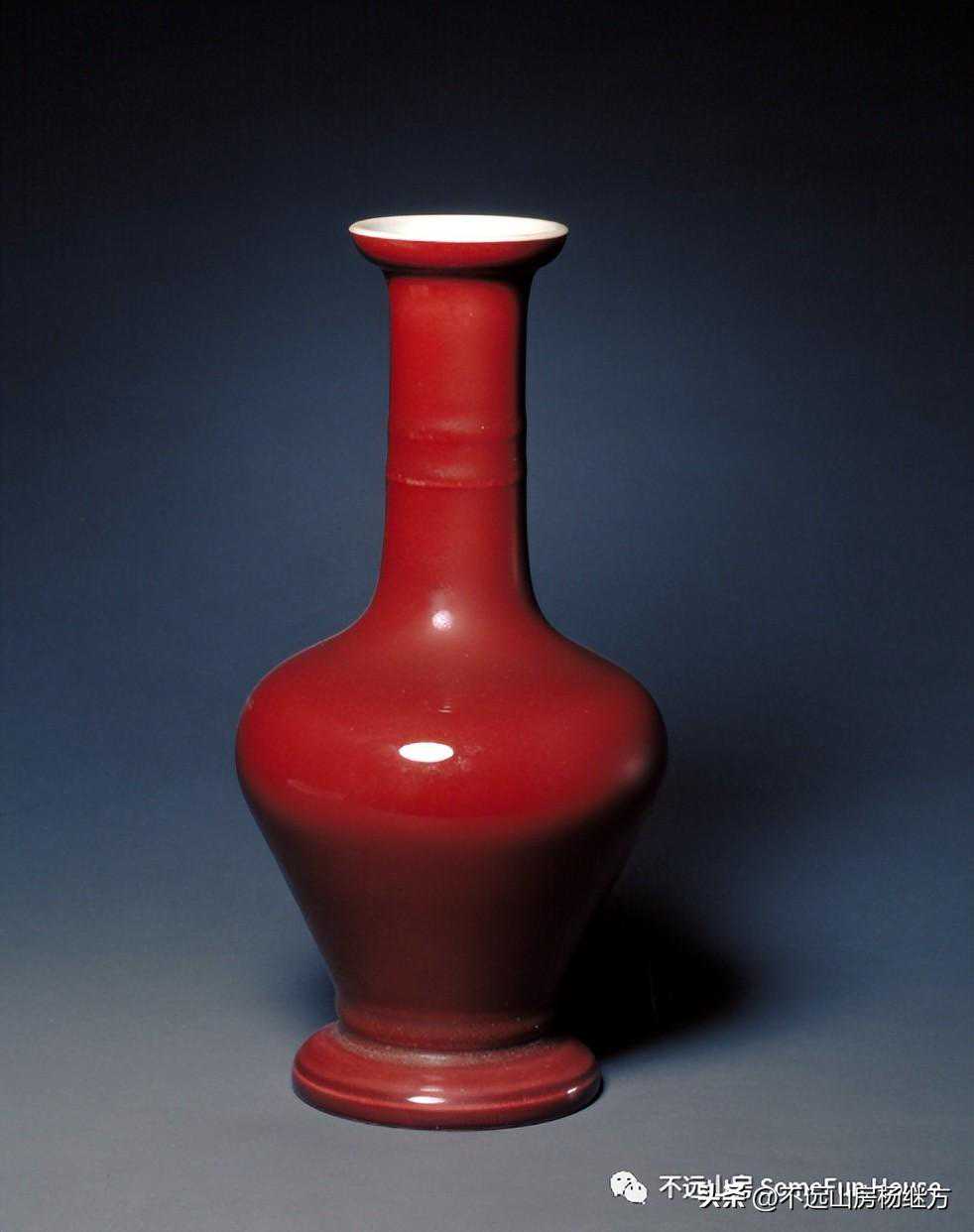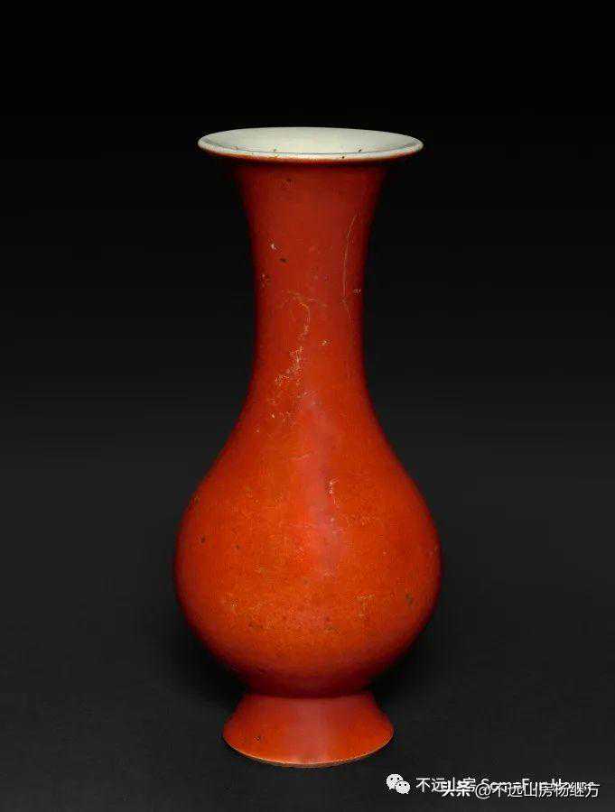 铁红釉,又称矾红、珊瑚红釉,是以氧化铁为呈色剂,在低温氧化气氛中烧成的一种微带橙黄的砖红色釉。雍正时的珊瑚红器釉层薄透而均匀,有明显桔皮纹色调沉着光润精美,呈现出富丽堂皇精致典雅的宫廷气象。珊瑚红釉是康熙时期创烧的低温彩釉,以铁为着色剂,因其釉色红中闪黄,色如红珊瑚而得名。此品颈部细长,器形秀美挺拔,如美人娉婷婀娜,全器满施珊瑚红釉,釉色细腻匀净,鲜艳纯美。《陶雅》谓之“华贵中之佚丽者也..匀净明艳,殆亡伦比。紫晶逊其鲜妍,玫瑰无其娇丽。”胭脂红虽然在康熙中早期就传入景德镇御窑厂,但是由于科技含量较高、造价较昂贵,直到康熙末期也没有被御厂普及使用。雍正中后期,由于御窑厂制瓷的发展革新,胭脂红逐渐推广使用至众多彩瓷领域。
