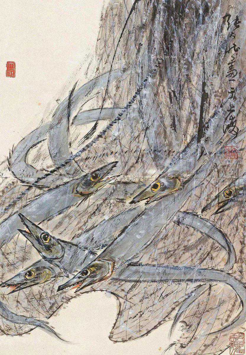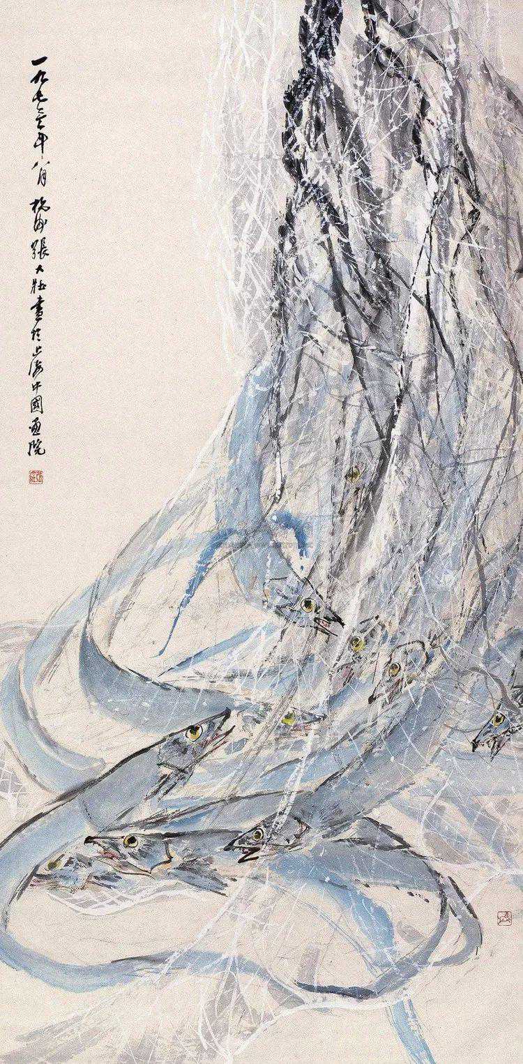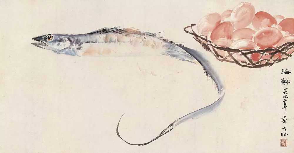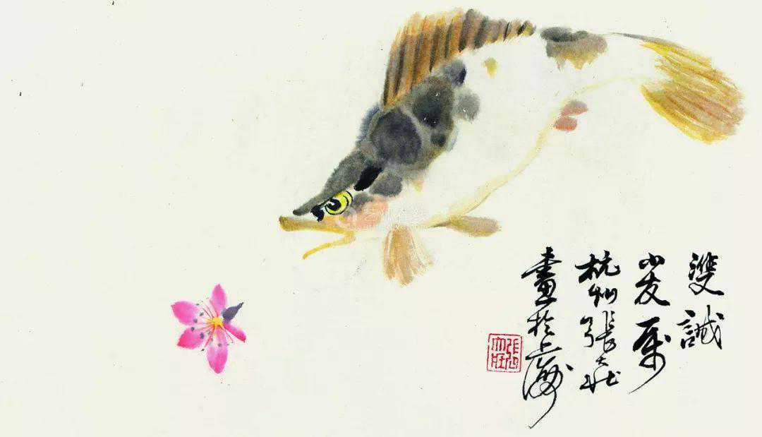 只见他打开砚盖,轻轻地磨墨,在宣纸正当中,用羊毫笔自由地转动出一个汉字草书“之”字。观者纳闷,所画何物?怪哉!怪哉!待张先生用浓墨间以焦墨画出鱼头,以中墨画出鳍来,大家才纷纷称奇,连称“带鱼!带鱼!”