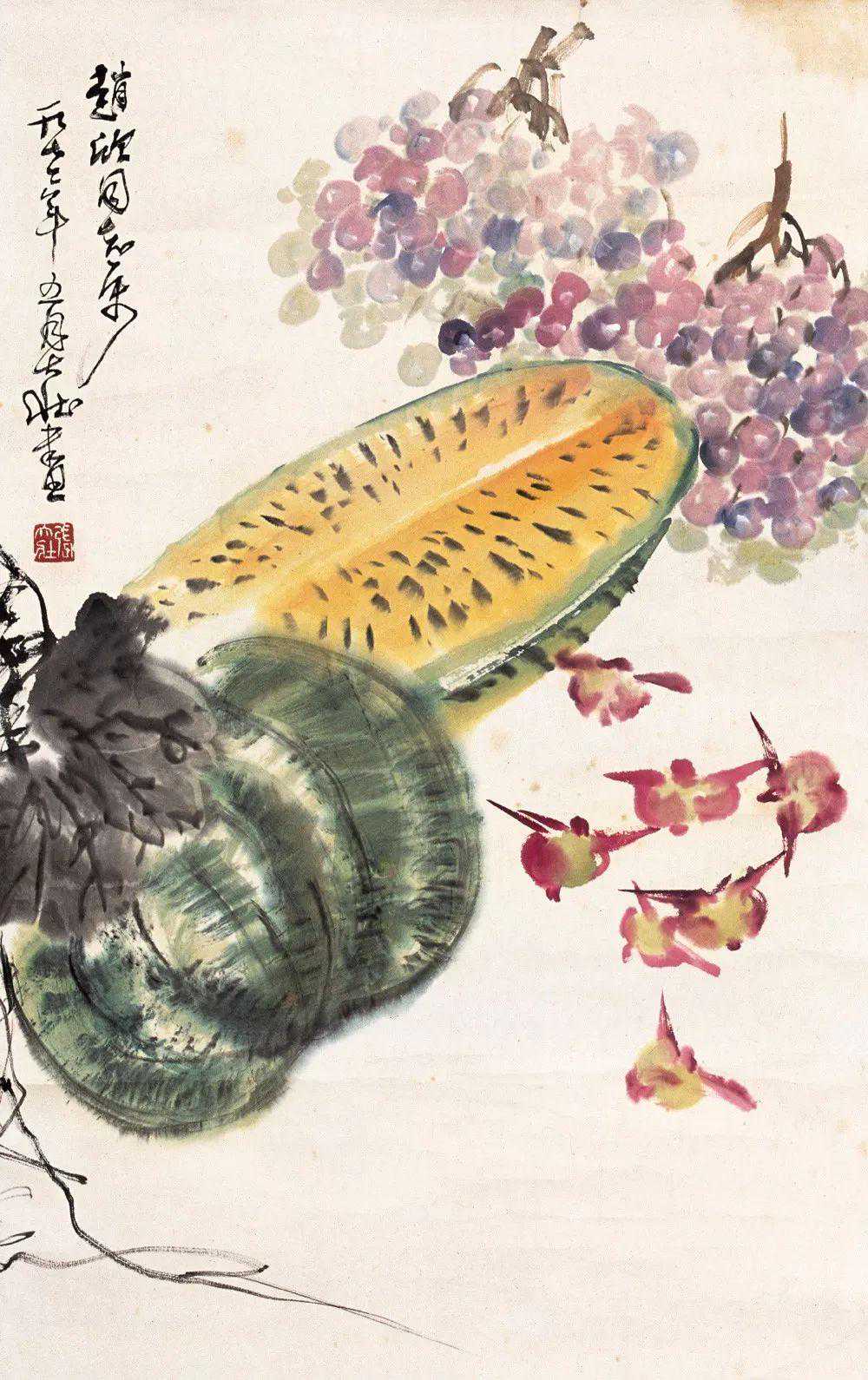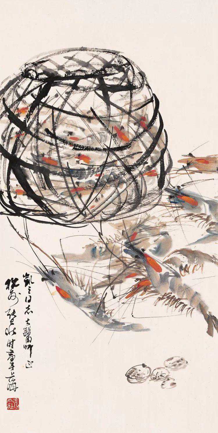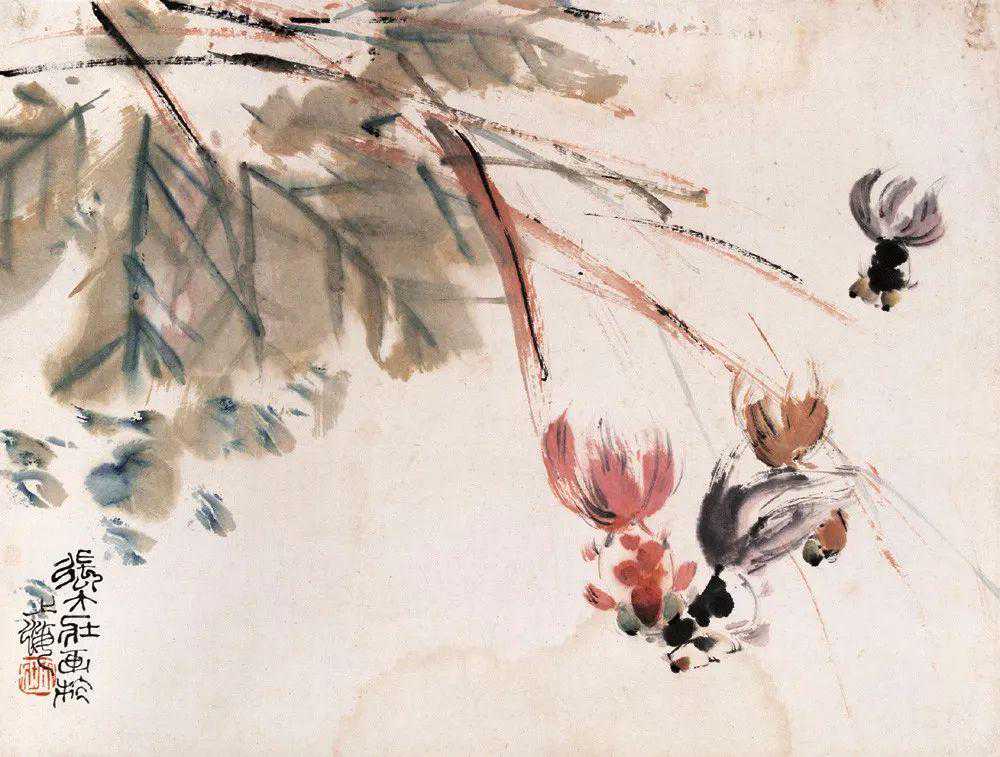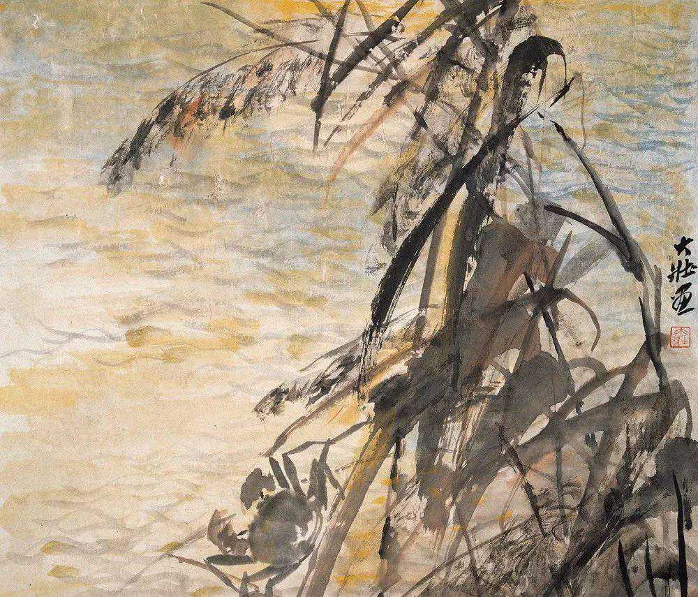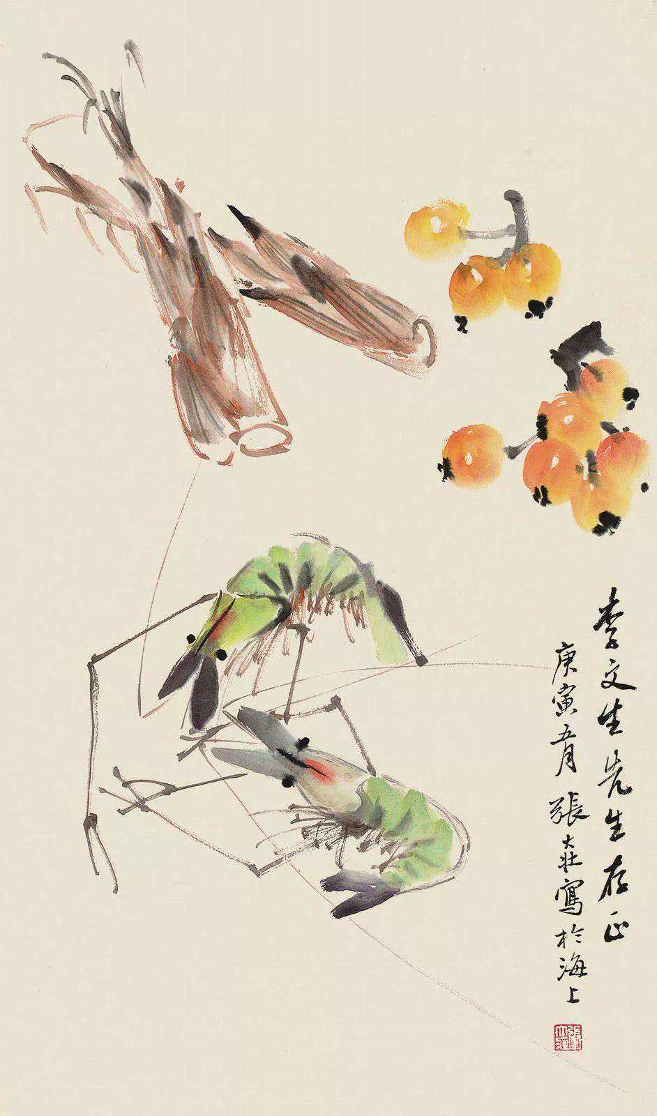 张大壮1916年到上海,随李汉靖学习恽派花卉,又从汪洛年习山水。1920年入商务印书馆任美工,次年为收藏家庞济元“虚斋”管理书画,得览名迹,心摹手追,画事大进。晚年渐涉徐渭、陈淳、朱耷等人,笔墨老辣,纵放洒逸;他特别喜欢画蔬果、虾蟹之类,生动活脱,别具韵致;偶尔画山水,风格近王原祁,用笔生涩清劲。
