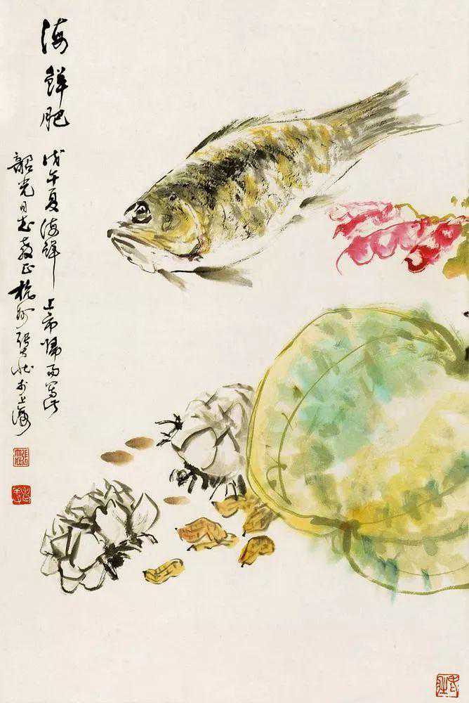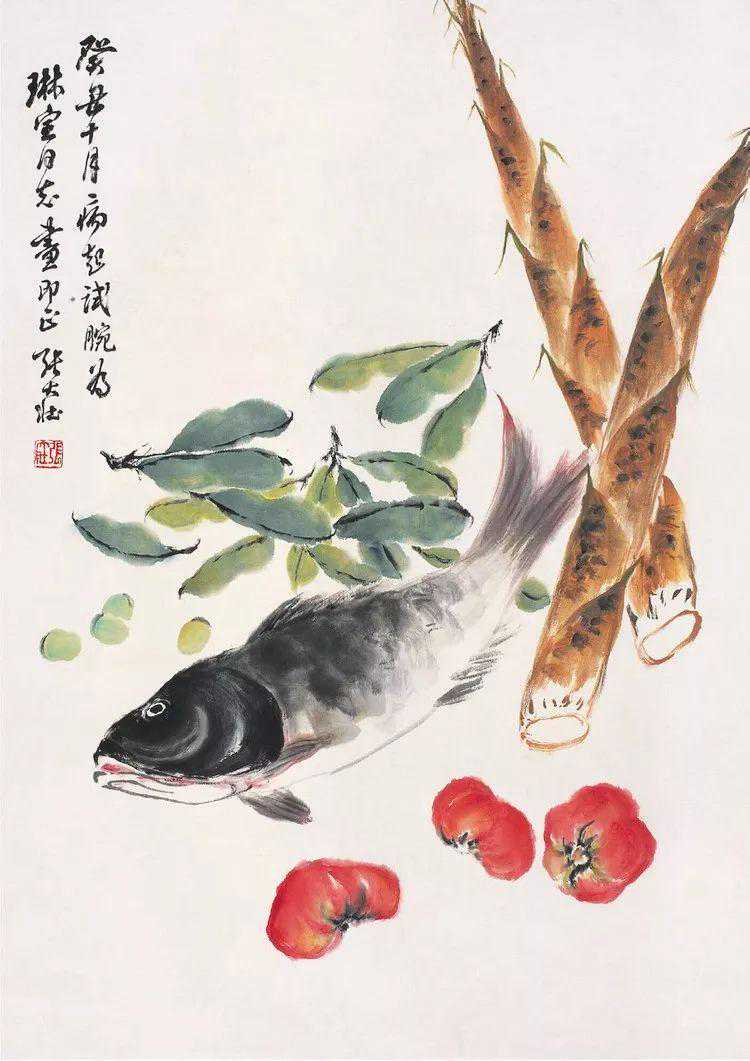 张老又握笔,隶篆相间,在带鱼下面加写一段跋语道:“此帧画成,旁观者俱欲得之,卒为老菜根所有,翰墨因缘如此。”书写“老菜根”三字时,特意停下笔,问我同意否?当获得肯定的答复后,他才将跋语写完。因为笔者姓名与此谐音,张老偶尔也爱开个玩笑,故有此问。