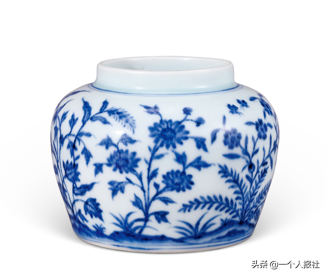 本品直口,短颈,丰肩,扁圆腹,圈足。器以青花绘菊花、石竹等盛开的花卉,间绘蝴蝶翩跹翻飞,摇曵飘香,为成化时期御窑瓷器。《博物要览》评价有:「成窑上品,五彩供养浅盏,草虫浅盏。青花纸薄酒盏,五彩齐箸小碟香盒……各制小罐,皆精美可人」。本品造型饱满,胎质细腻,釉质温润肥腴,画意生动,绘制纤柔精细,疏朗明快,为成化青花器中的精品,展现出陶工高超的技艺和艺术修养。