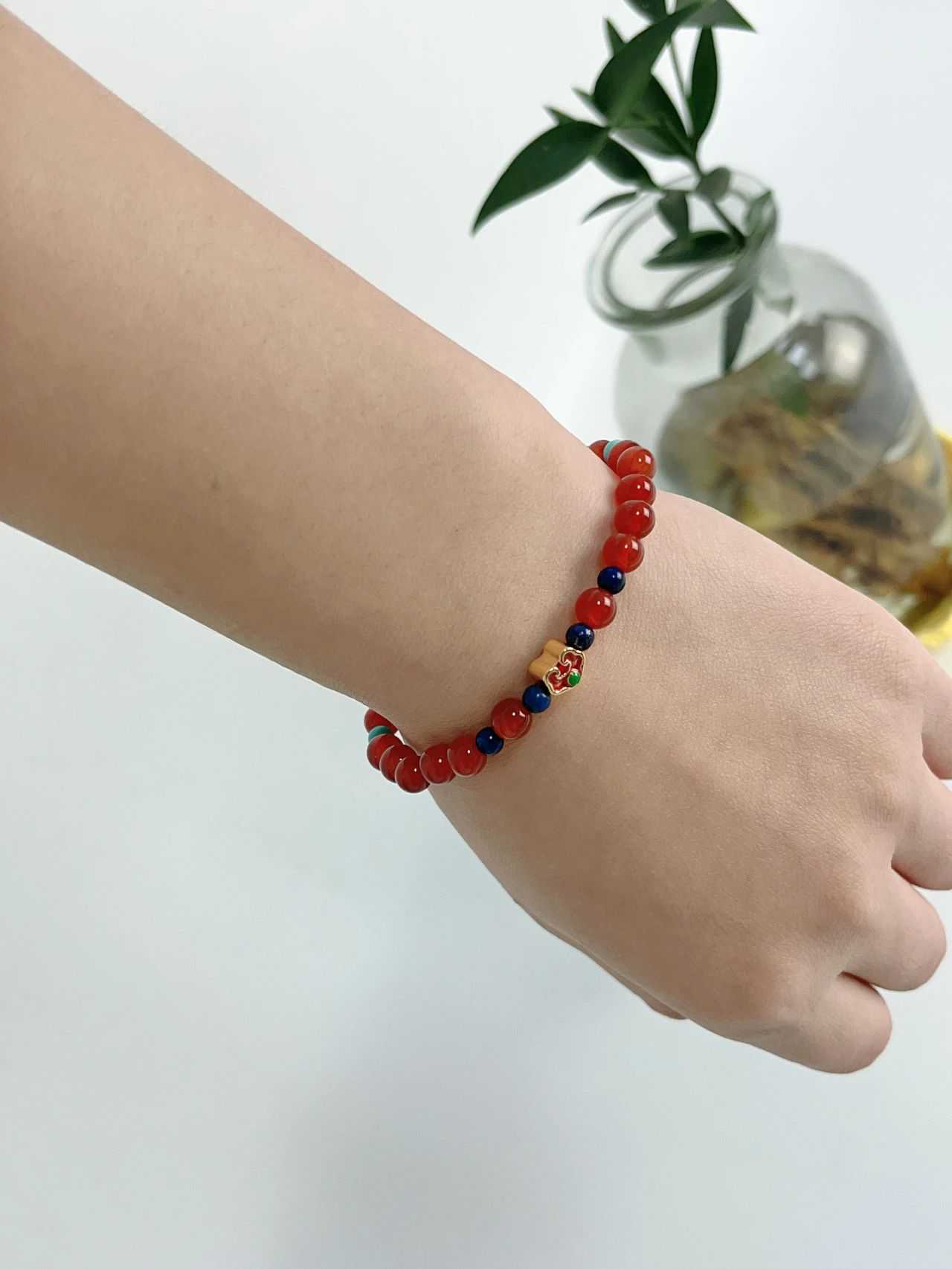 手链主体是由红玛瑙、绿松石、青金石串成,并且串有柿子造型的红玛瑙,和如意造型的低温珐琅,取名“柿柿如意”,寓意事事如意,心想事成!