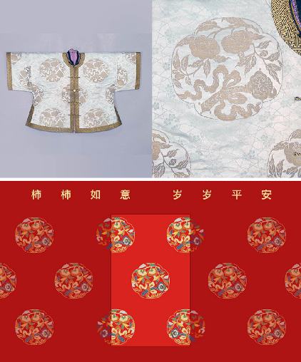 包装可大有讲究呢!花纹出自故宫藏品湖色团花事事如意织金缎绵马褂,这也是清朝皇帝的便服,纹路为金柿蒂形开光柿子和如意纹样,谐寓“事事如意”。