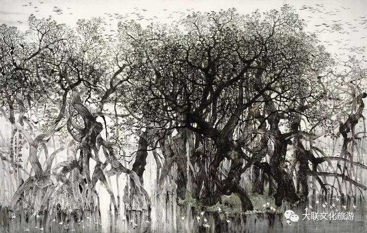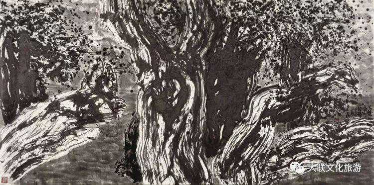 然而,联系起来看,陈克永的大山大水,却以拙厚繁密的笔墨,夸张了折落的大山的方中有圆有力度,又以干粗叶密树冠浑圆层叠的张力,造成了前人所无的浑厚雄强和波澜壮阔,呈现了自树一帜的绘画语言风格。