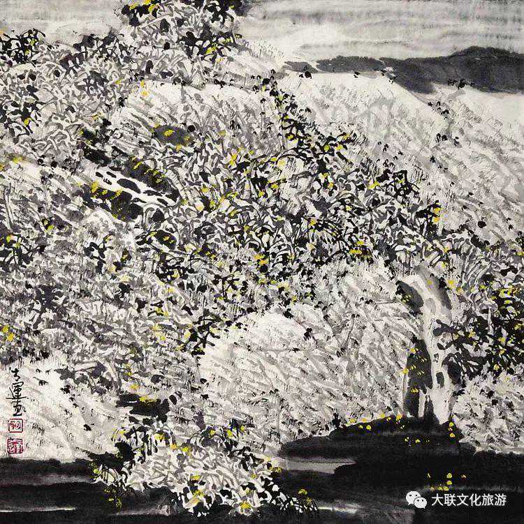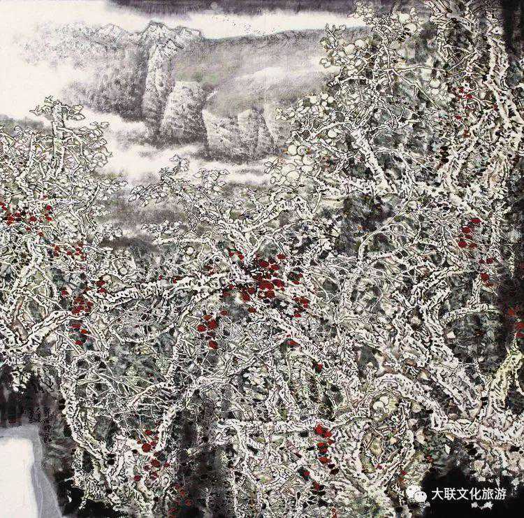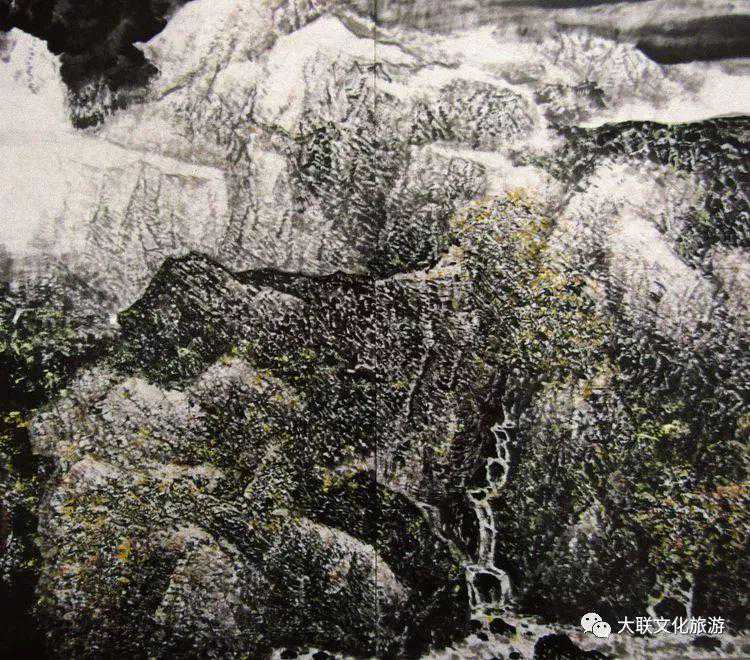 鞠太运的山水画就是在这种不断变化的情况下,经过凋整显示出其既具有现代意识、现代人的明确的宇宙自然观的吲时,又保有中国人习惯了的水墨画审美情结,这表现存他使用的语言手段和工具材质仍然沿着中国画的传统。我认为这不失为一种渐进的但又是较稳妥的道路。