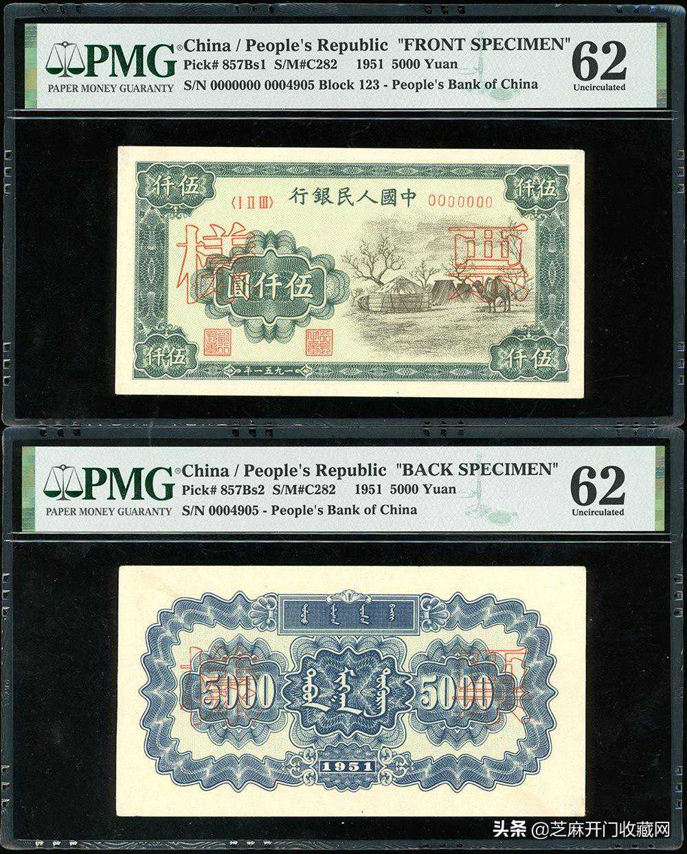 中国人民银行第一版人民币5000元「蒙古包」正反面样票,控号0004905,均评PMG62,成交价格:HKD114000