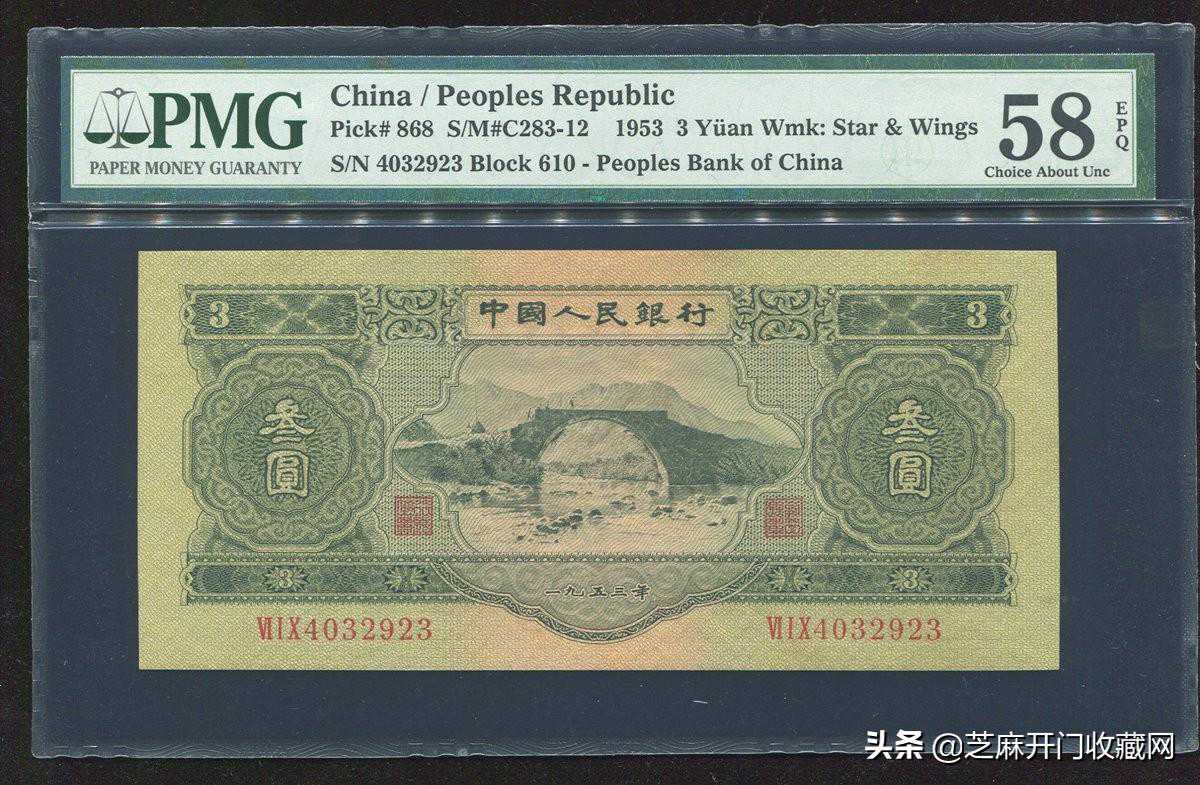1953年第二版人民币叁圆一枚,PMG58EPQ,估价:RMB25000,成交价格:RMB59800