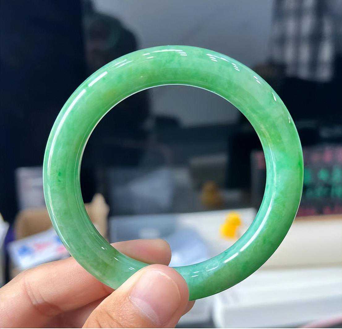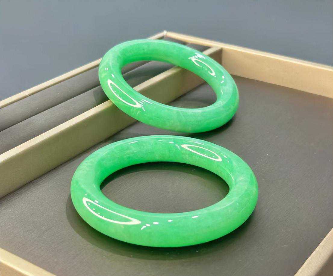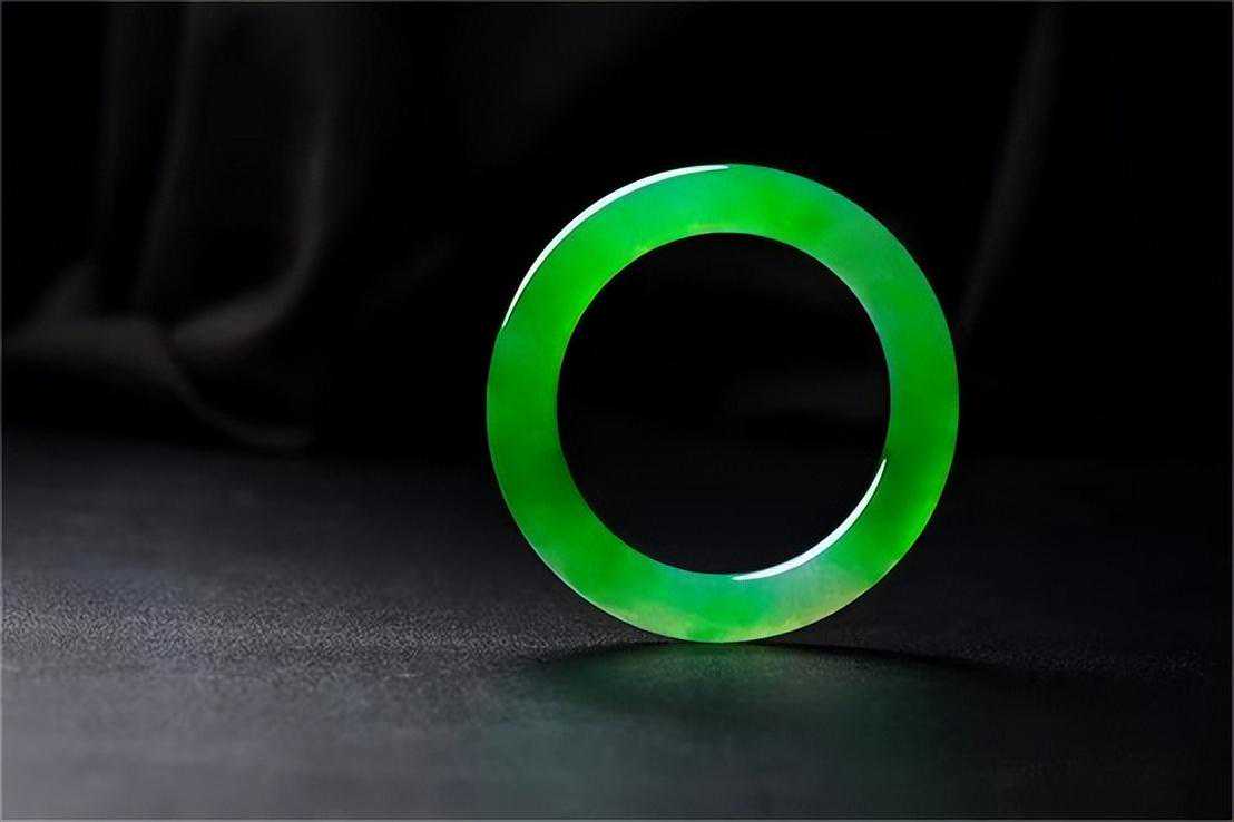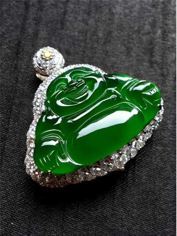 在色泽上几乎已经接近帝王绿,但比帝王绿明亮一些,是一种不偏黄也不偏蓝的绿色,碧绿欲滴,明艳动人。