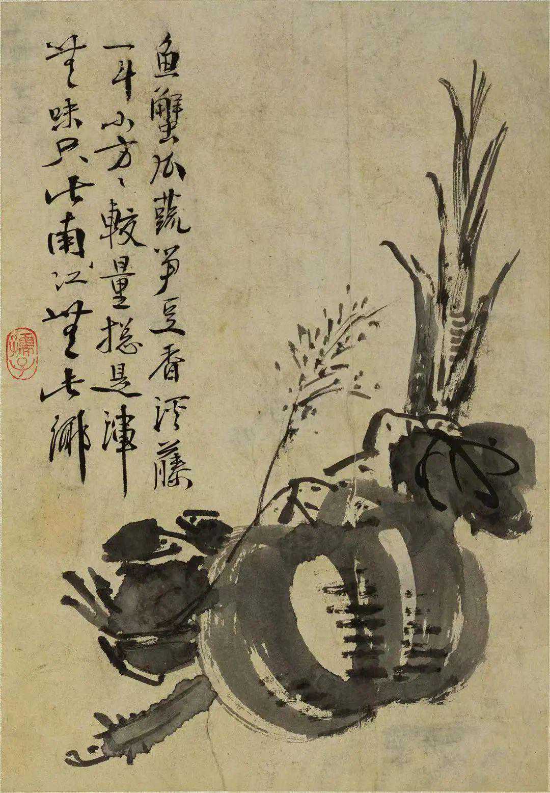 《花卉图册》为浙江省博物馆藏,共八开,依次绘墨笔蟹蔬、葡萄、蕉叶、牡丹、秋菊、芙蓉、修竹、石榴等,每图各有一七绝题诗,诗书画皆妙。