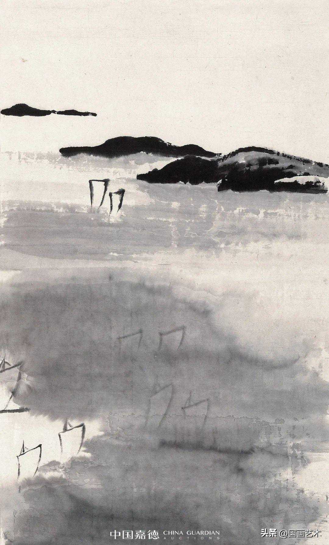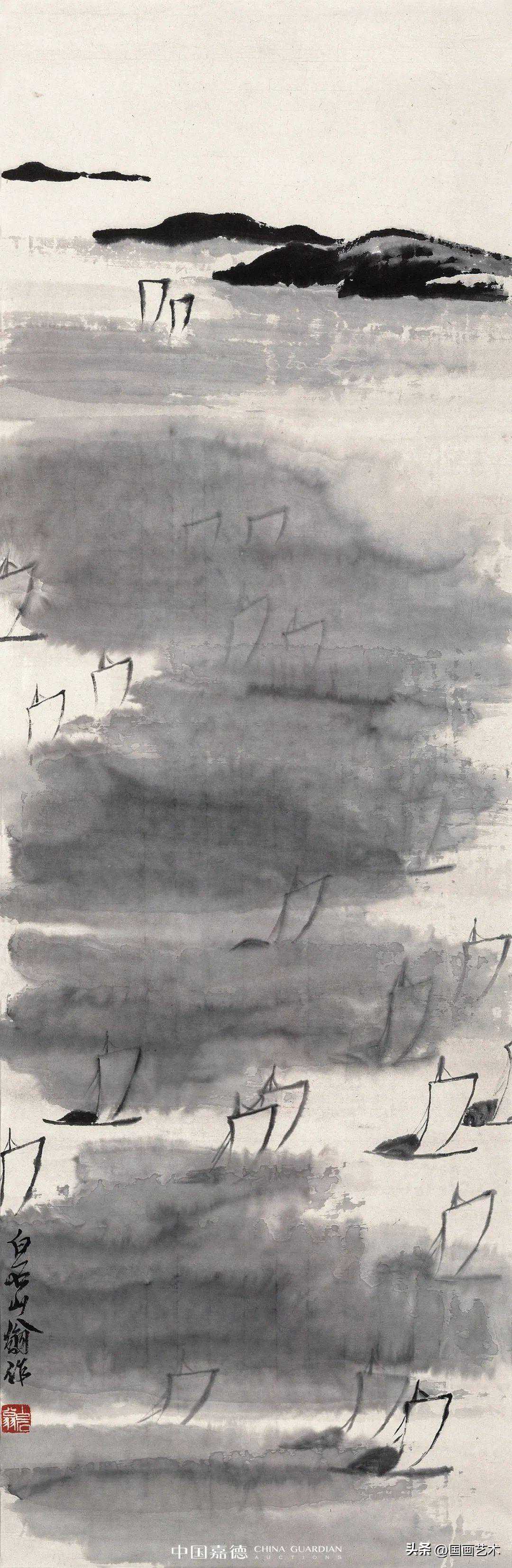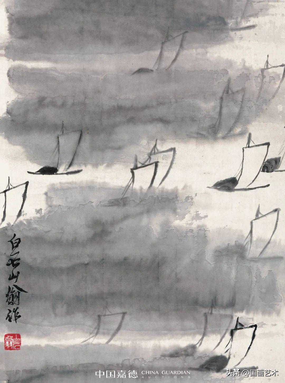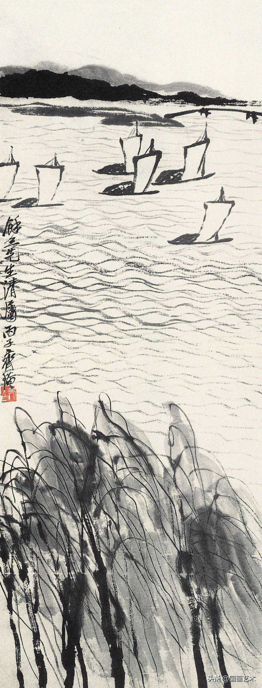 齐白石几度过湖渡海,扩大了心胸与眼界,画面描绘的是远近风帆争轲于浩渺的烟波之中,不见船只,只见风帆隐然出现丁波浪中,抽象却又具体地表现出了大海航行中的惊险,用笔极简,让人寻味他笔下的江河湖海,大都是远游时曾经飘历过的水面。而水的表现方法,也颇有特色。淡墨横扫的平行波纹表现浩渺的浮光动感,尤为深远壮观。