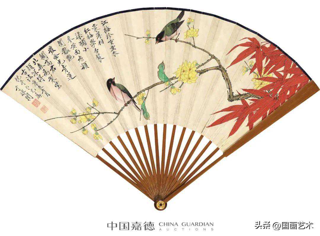 庚辰夏,于非闇得京城著名笔庄青莲阁新制紫颖笔,颇合用,心手相应下遂为友写折枝双雀。非闇之画最得益于宋人,此扇图形颇得宋人折枝神韵,勾勒点染精严而不失灵动,一片生机盎然。于氏吸收宋人缂丝轮廓明晰的装饰趣味。布局严谨,形象生动,用笔劲健,设色明丽典雅,以挺劲婀娜的笔力为骨,又以色彩的丰富表现为肌,将水墨勾勒、皴擦、点染与青绿设色相结合,浓丽庄重中,兼具清淡雅逸,并与瘦金体题识达到和谐的统一。画面富丽而充满诗意,在继承中大胆融入自己理想化、充满明丽之心的审美情趣,正是对宋人花鸟情怀的张扬。