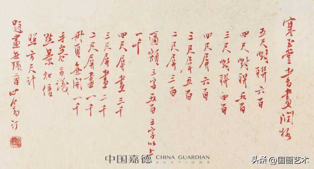 (五)虾蟹合作之纸(宽一尺二寸,长四尺,作为五尺何如?)新润每方尺廿元;芭蕉鸡子,方四尺,八十元;扇面画廿五元,书优待,作画之半价,如作篆书廿五元。承数千里之索,不言加二。