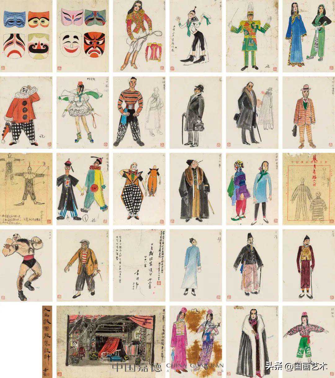 题识:大马戏服装设计廿二图。计廿八套。叶浅予,十一,十二。制图时颜色不够全,稿不能做为定案,裁制时请加调整。此系一九四四年冬季居渝时为鲤庭同志所作,今得重温旧作,不胜喜悦。浅予一九五三,七,五,北京。