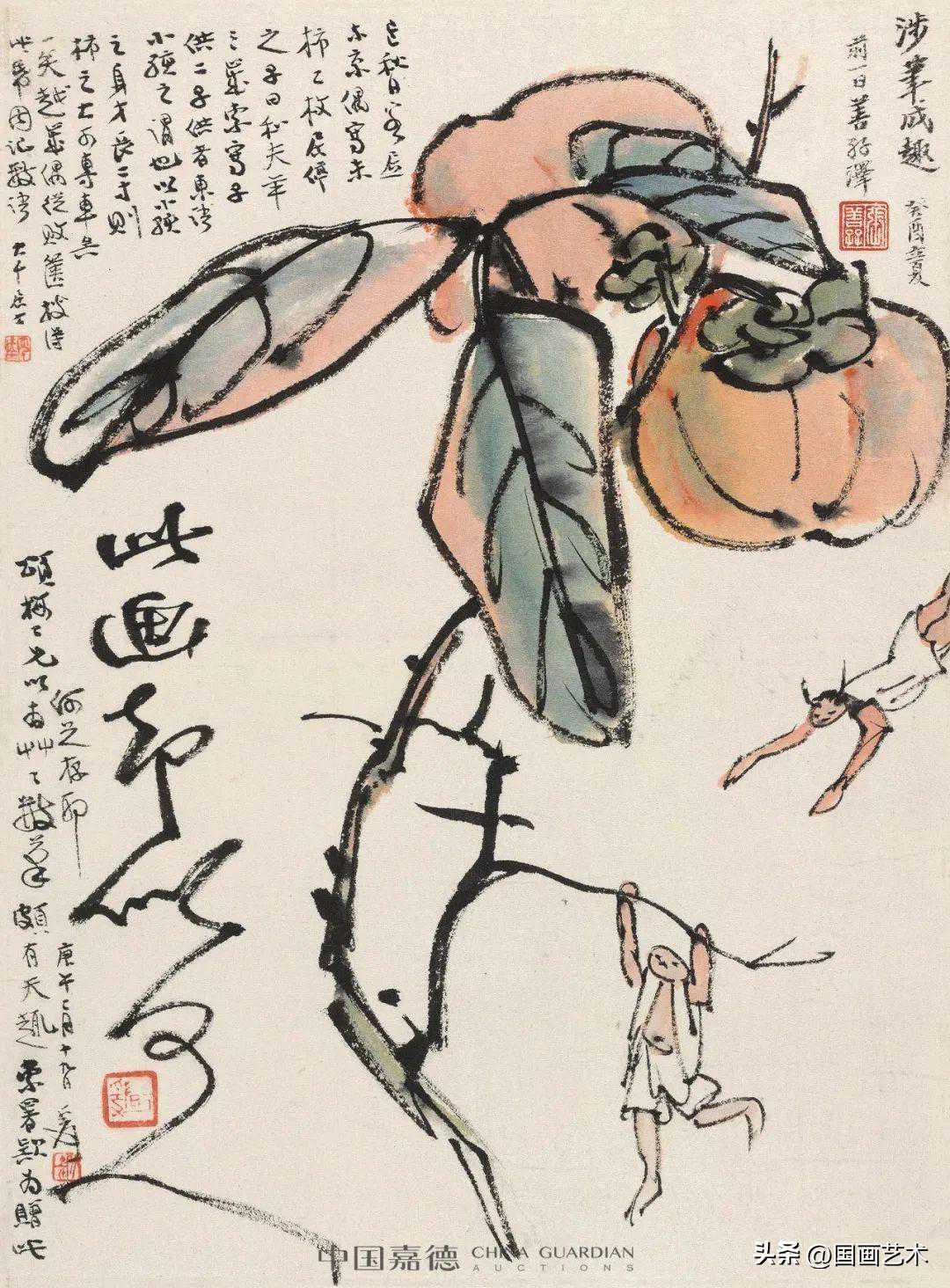 (二)己巳秋日客居东京,偶写朱柿二枚。居停之子曰和夫,年三岁,索写子供二。子供者,东语小孩之谓也。以小孩之身,才长二寸,则柿之大,可专车矣,一笑。越岁偶从败箧搜得此纸,因记数语。大千居士。