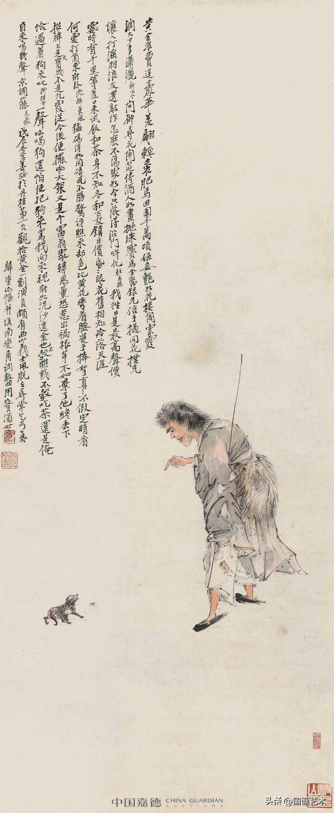 题识:黄金浪费逞豪华,羡翩翩轻裘肥马,田园千万顷,姬妾艳如花。楼阁云霞阔,大少多潇洒。新水令。问柳寻花,开筵侍酒人如画。抛球赛马,金币银元信手挝。同花扑克让人打,淫朋浪友还敲诈。怎么不荡家,如今只落得沿门叫化。驻马听。我往日是最高声价,霎时有千里等差。口未试饭和茶,身不知冬和夏。镇日价,昏昏眼花,旧相知,冷落天涯。何处打个求财卦。沉醉东风。猛踢得如同砖瓦,不胜惊讶。瞧来却色比黄花,弯着腰双手捧拿,真真不假,定睛看,招牌上是天宝,不是九霞。从今后便摆些大架,又是个富翁家。转思量,恐惹出祸根芽,不如弃了他。才丢下,恰遇着狗来叱。折桂令。一声吆喝狗还怕,便把狗来骂。我向来视财如泥沙,这金也不彀瞧戏,不彀吃茶。还是俺自来唱几声京调罢。尾声。戊辰冬至,善孖于丹桂第一台观拾黄金一剧,演员颇有西山义士风,脱去寻常乞丐气。归涂此幅,并填南变角调数曲,用警浊世焉。