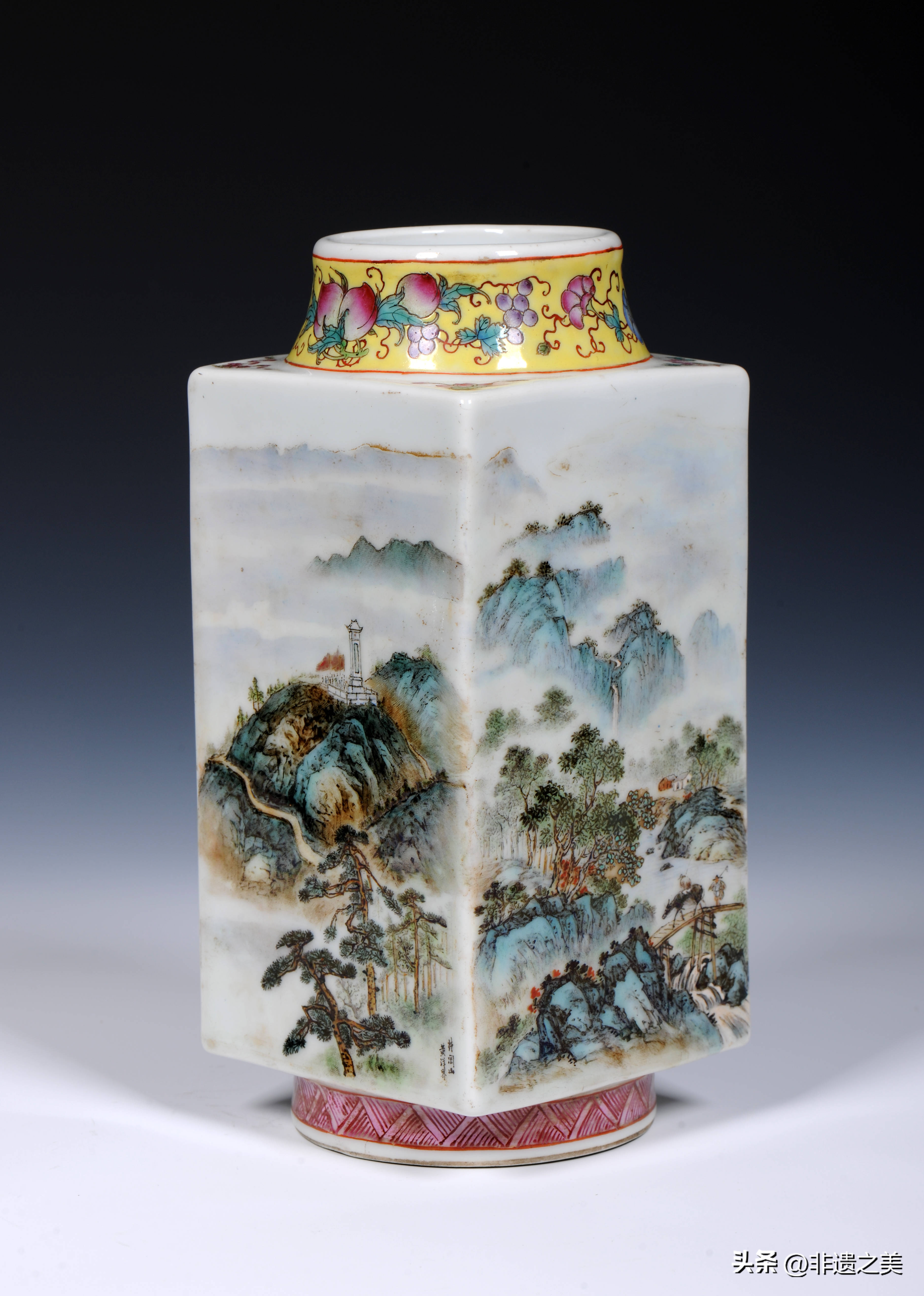 2、以各种色地开光或锦地开光,内绘山水、人物或花鸟、有锦上添花之称;