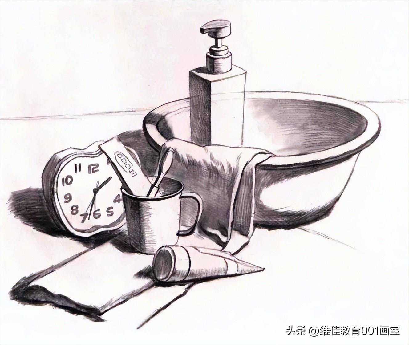 表现时要注意塑料盆和杯子的透视变化,洗发液瓶的造型相对复杂,结构转折关系及细节特征要画准。