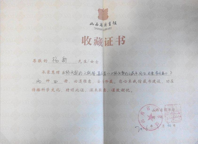 目前而言我们力所能及的就是将编印成册的《桥头契约》(影印稿)无偿捐赠给了山西省图书馆。(见附图)