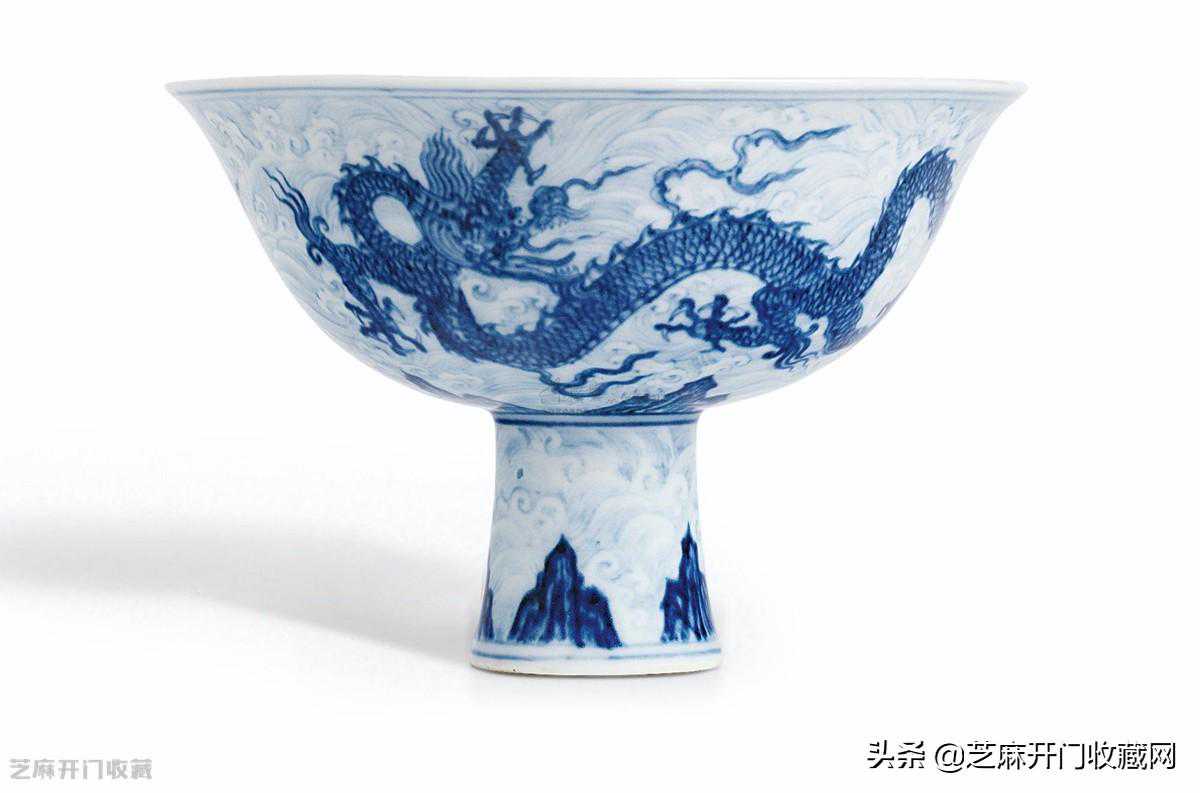 3:明宣德青花暗花【海水游龙】图高足杯,尺寸:直径15.4厘米,成交价:HKD112,660,000