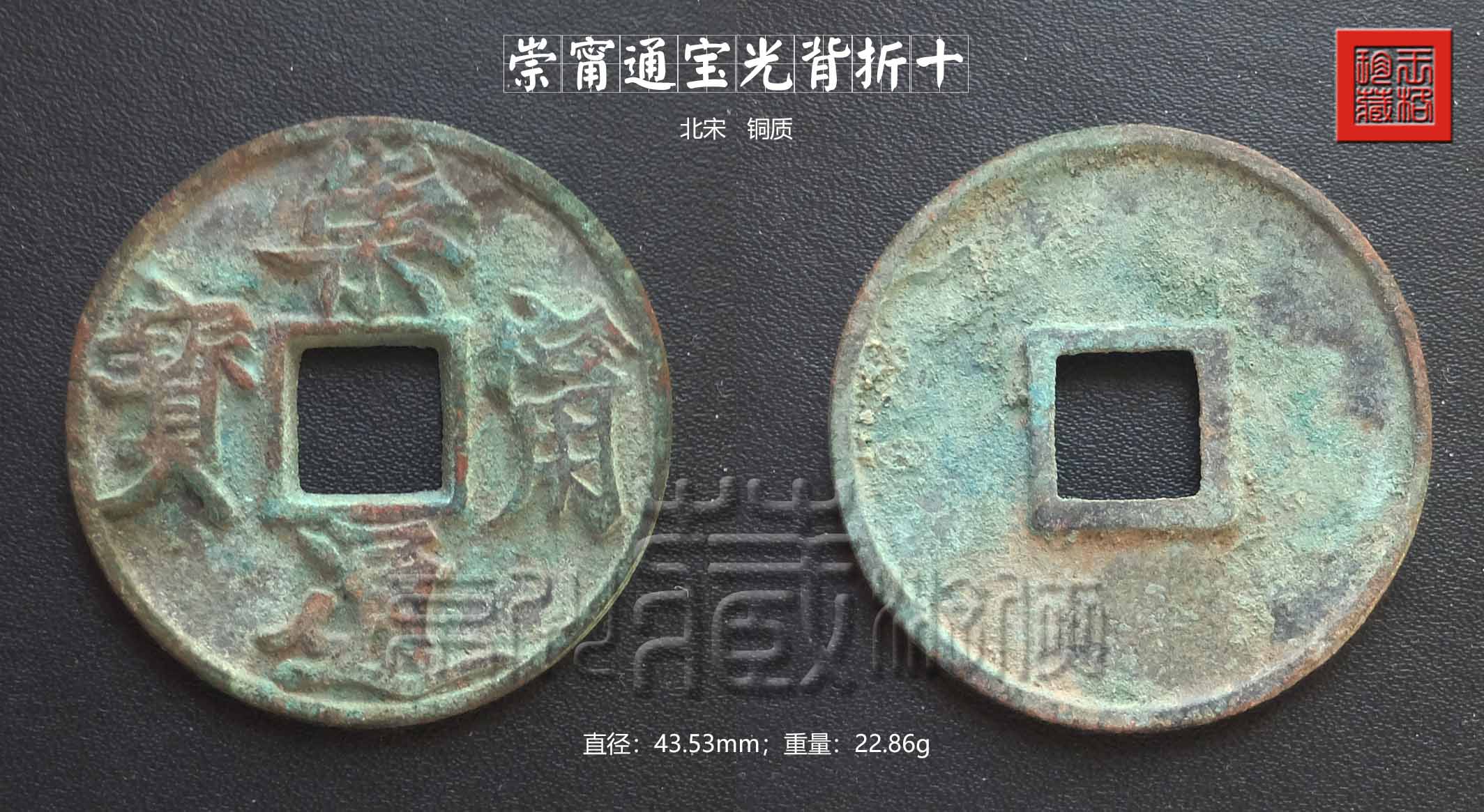 如是,一番鉴赏,无需赘述,此枚“崇甯通宝折十型”铜钱,三相一材,难以挑剔,可谓开门见山,真实可靠。如前所述,该“甯”字钱,早前所见皆折五型大小,而折十型则十分的罕见,虽不至于存世一二,然检索公展,凤毛麟角,确书珍稀难得,收藏价值相对更高,乃不言而喻。