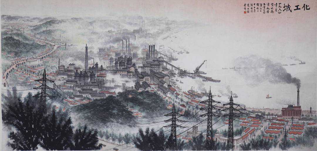 1964年11月,为了参加第四届全国美展,江苏省国画院遵照江苏省委指示,以南京化学工业公司为题材,集体创作一幅反映江苏省工业建设成就的作品。通过参观南化各主要生产厂、专用铁路线及江上运输码头,并乘船从江面上察看了厂景,画家们找到了描绘化工建设气魄的最佳位置。在最终合作绘成的作品中,山峦起伏、江面浩瀚、烟囱林立、鳞次栉比的塔罐尽收眼底,化工城的壮阔气势跃然纸上。画卷从近景的茂密树林渐次向远处展开,穿过高压线铁塔,映入眼帘的是中景的化工城。这座凝聚了人民汗水建设而成的化工城占据了画面的中心位置,与平阔江水的留白紧密呼应,彰显出中国工业建设的昂扬澎湃。这件精雕细琢的作品后来在美术史上被誉为“江苏省国画院集中最强的实力予以体现画院风格的一幅代表作,也是一幅以中国画来表现现代工业题材的杰作。”
