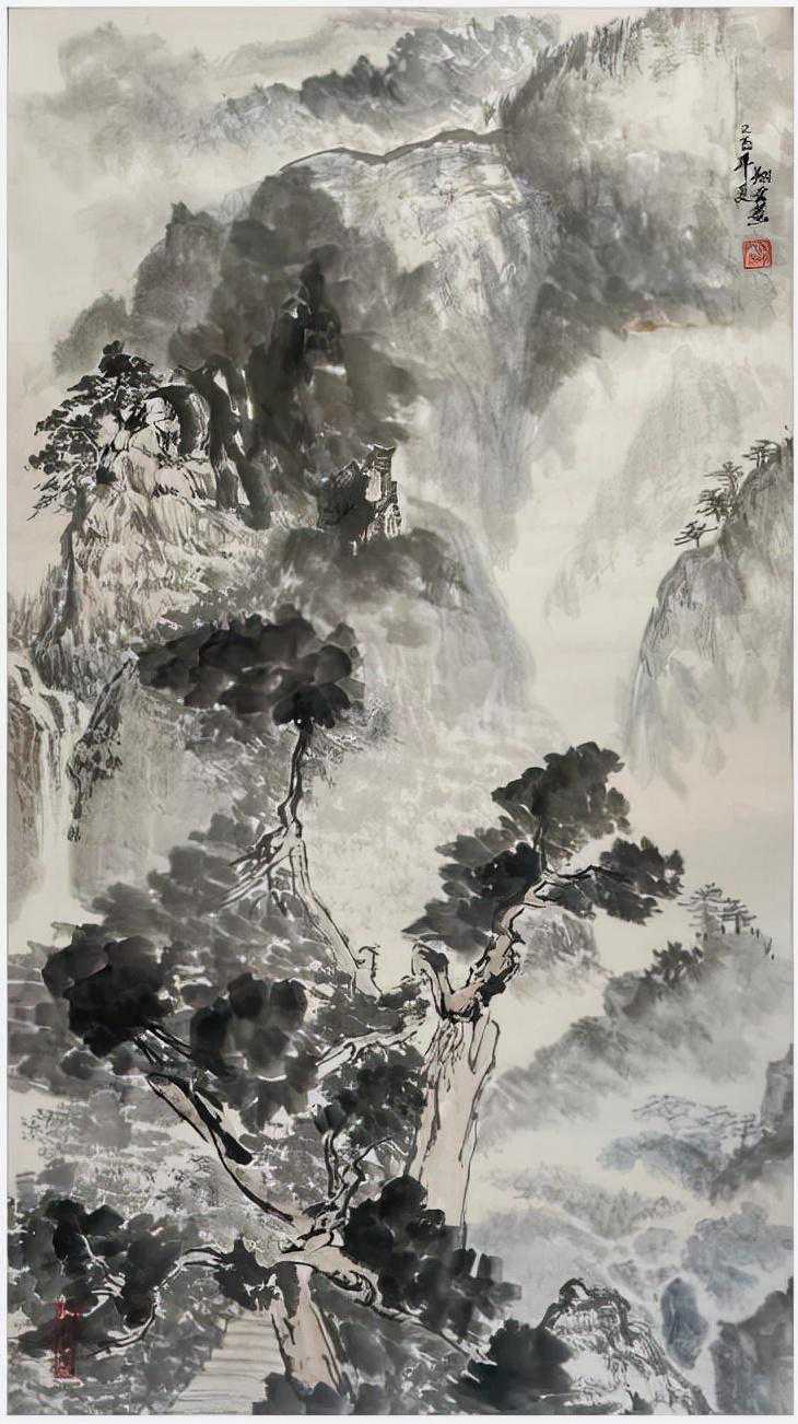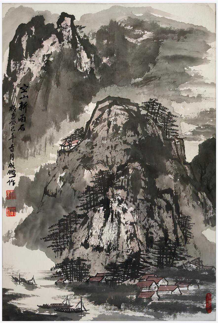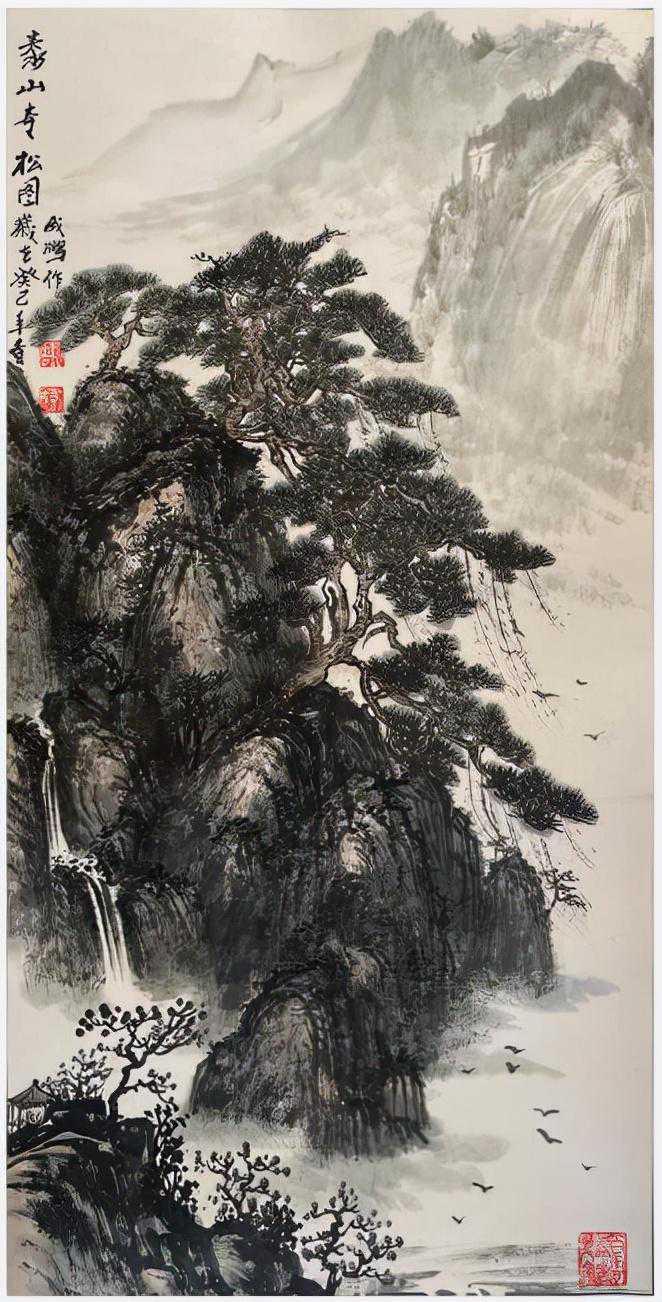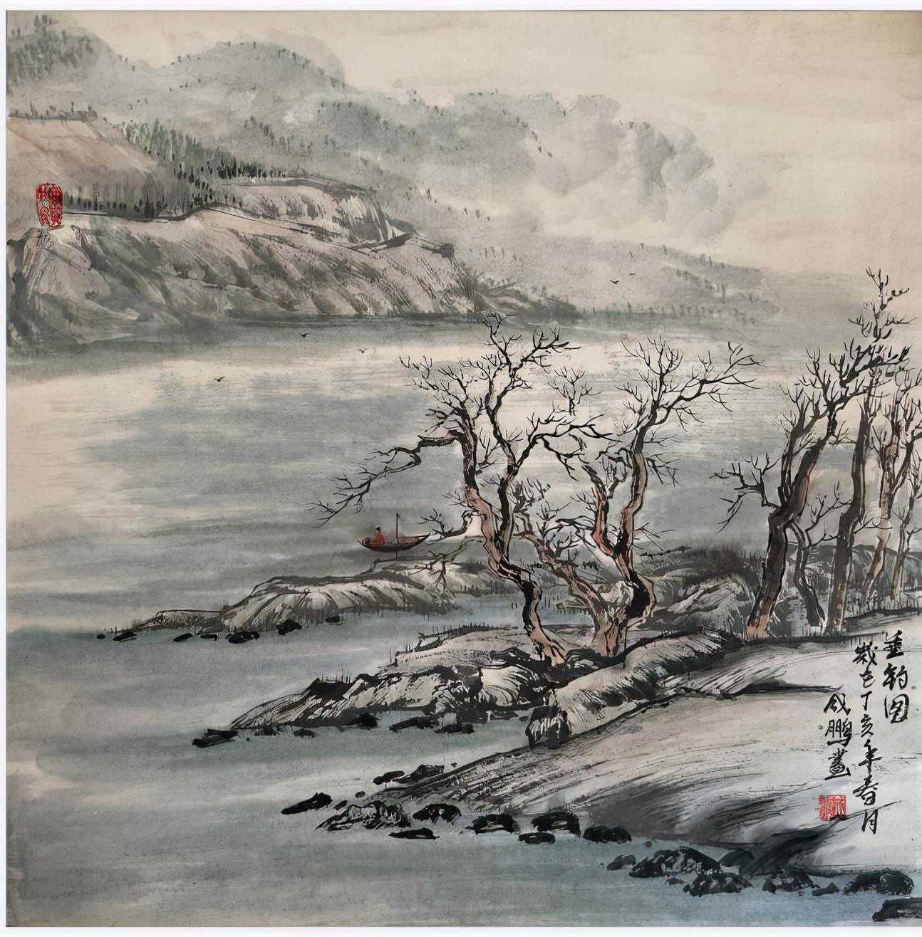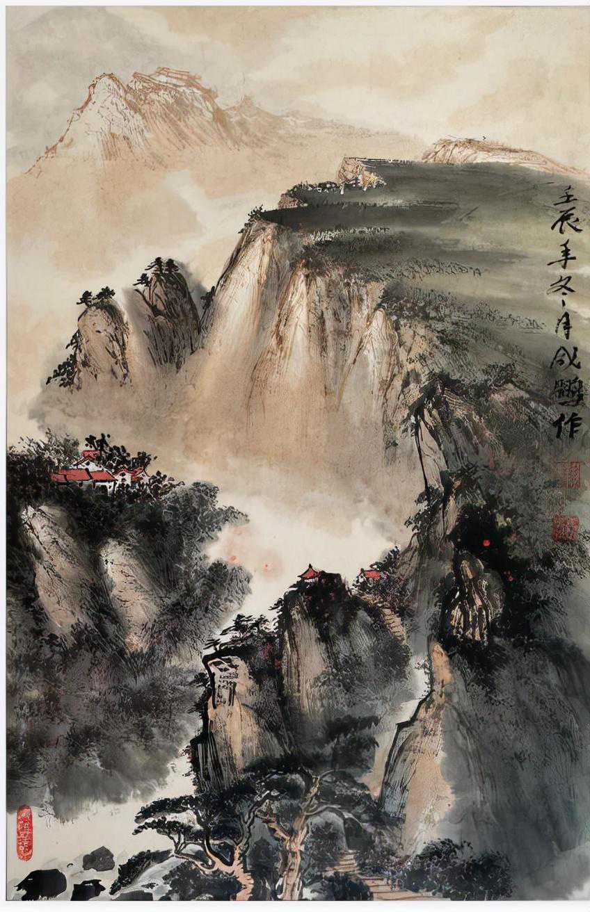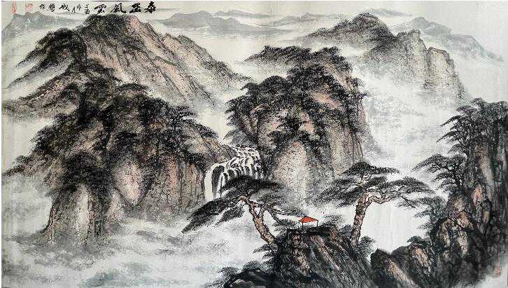 成鹏作品构图严谨润色典雅能在传统技法的基础上博彩众家之长、锐意创新,在艺术上有较大的突破,从成鹏的山水画中我们可以体味到中国画的意境格调。气韵和色调的秉承,成鹏主张一件作品首先不在于像与不像,而在于作品的主题,或者说作品中辐射出的某种观念和思想,某种情绪能否紧张的抓住观赏者的心弦,能否给人以充分的艺术审美享受,并使人从中获得某种启迪和教育,这才是艺术作品真正目的,以黑为笔,笔精墨妙,色调丰富,文秀沉实,通过对自然景物的描绘,表达出整个人生的环境、情绪和气氛的整体格调,这才是创作者的主题思想。