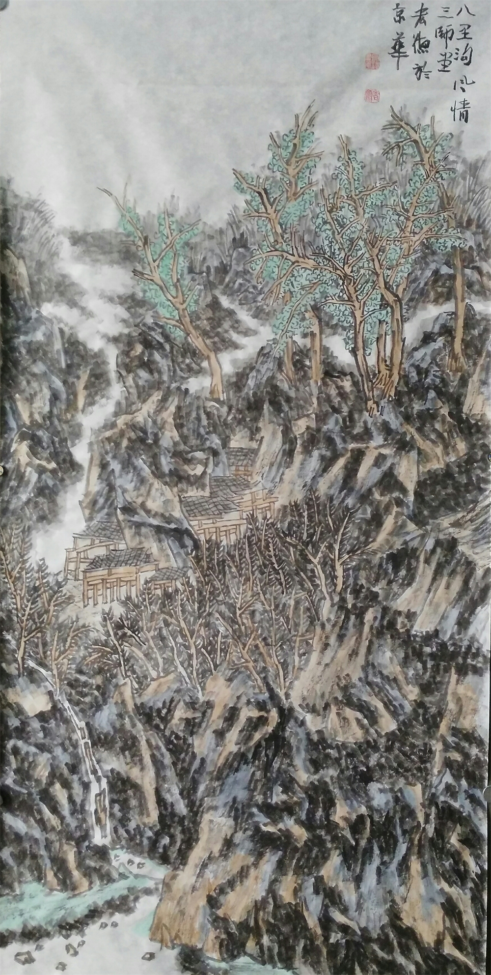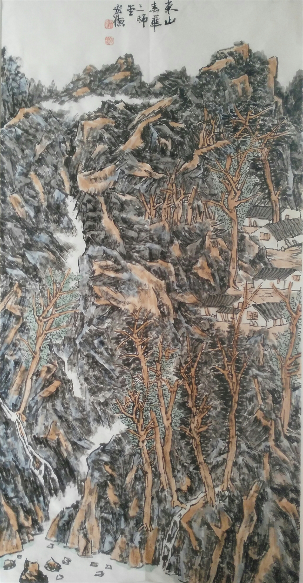 “于墨海中立定精神,笔锋下决出生活”(石涛语),“笔墨当随时代”,可见,中国绘画现实主义的优秀传统一直在继续。宏德先生绘画亦是有着“物象-心象-意象”的转变过程。他亦坚持“度万象而取其真”(荆浩语),并开拓出了一番境界,即有着真山水的势与质,也描写出了对精神家园的憧憬。他对画面内容的安排及空间构成的把握能力较好,于是让我们进入了“可望、可居、可行、可游”之境。