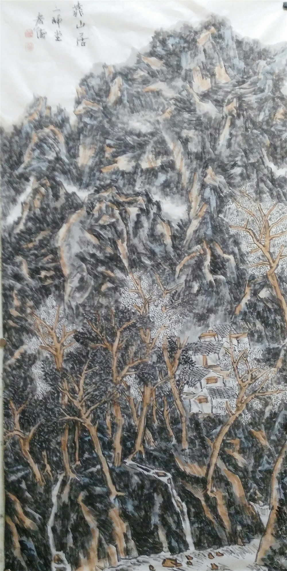 宏德先生对皱法的运用当是经过了一番推敲,没有拘泥于一山一石的画法,而是全面把握,把对真山真水的情感通过手中之笔谱写成俊朗、朴厚的画面。他继承发扬了自宋代以来山水画的成就,看其画面以斧劈皱法、米点皱法,把山石肌理,植被、季节、气象很贴切的表达了出来。而其全景式构图,其繁格的运用已见功力,读《近山村》、《长泉村》系列,用笔有着浑莽兴荒率的变化,这又透出他受了元画的影响。"抚琴动操欲令众山皆响”面对大山好水,这种心境让人动容,宏德先生首先是陷入自我的感动之中。