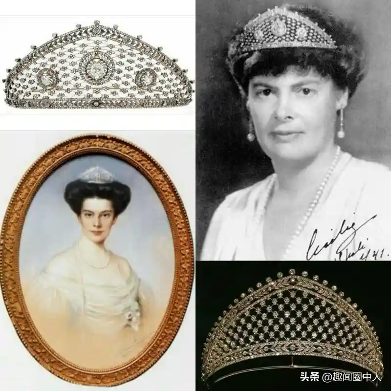 当然了,最奇怪的可能还是这顶和防盗网异曲同工之妙的钻石王冠,曾属于德国末代皇储妃塞西莉,是她结婚时娘家从法贝热定制的结婚礼物。