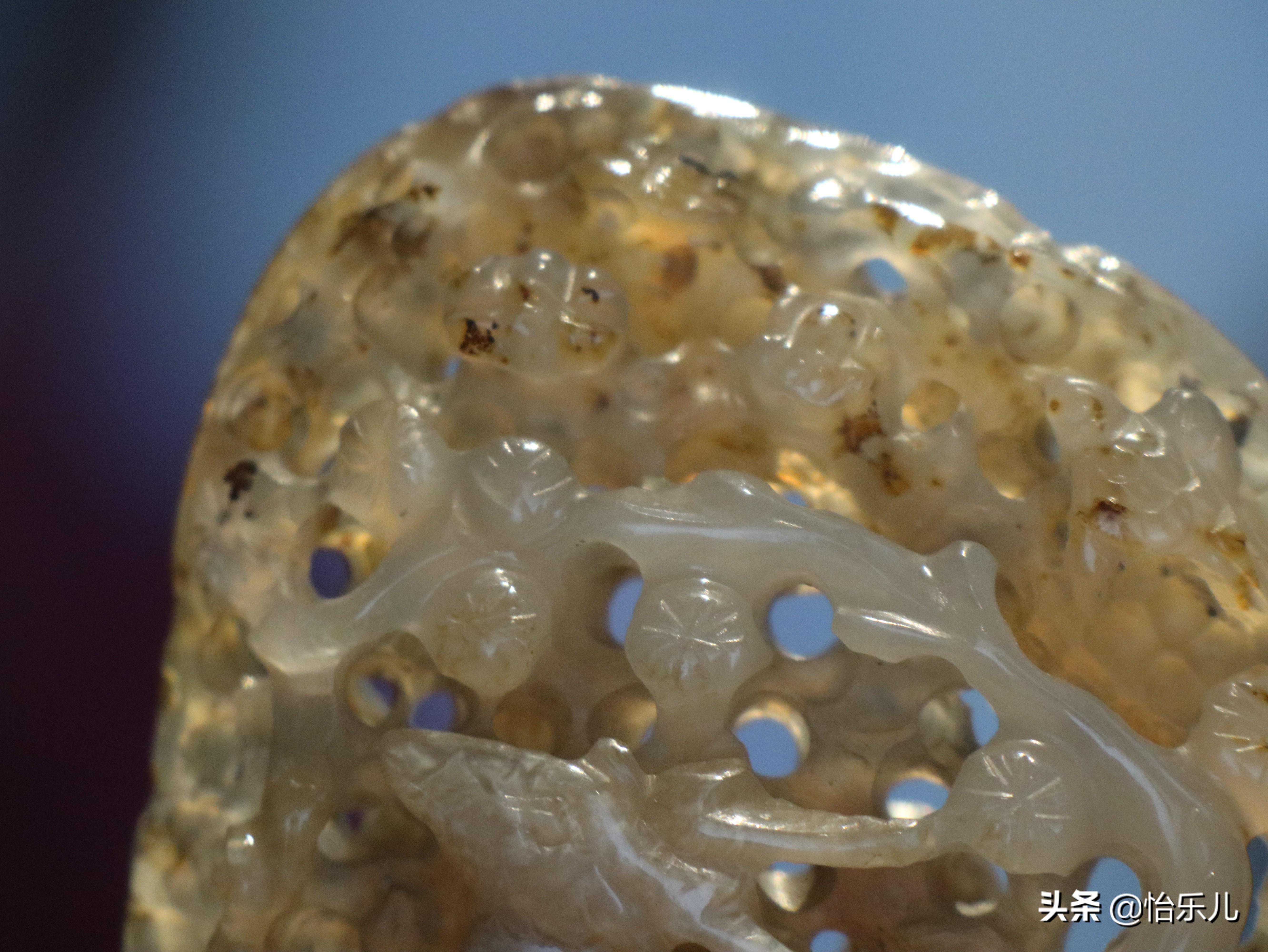 这件玛瑙饰为不规则形,是作者根据玛瑙的不同玉髓纹饰,因材施艺,采用镂雕、高浮雕、透雕等多种技法雕琢而成。