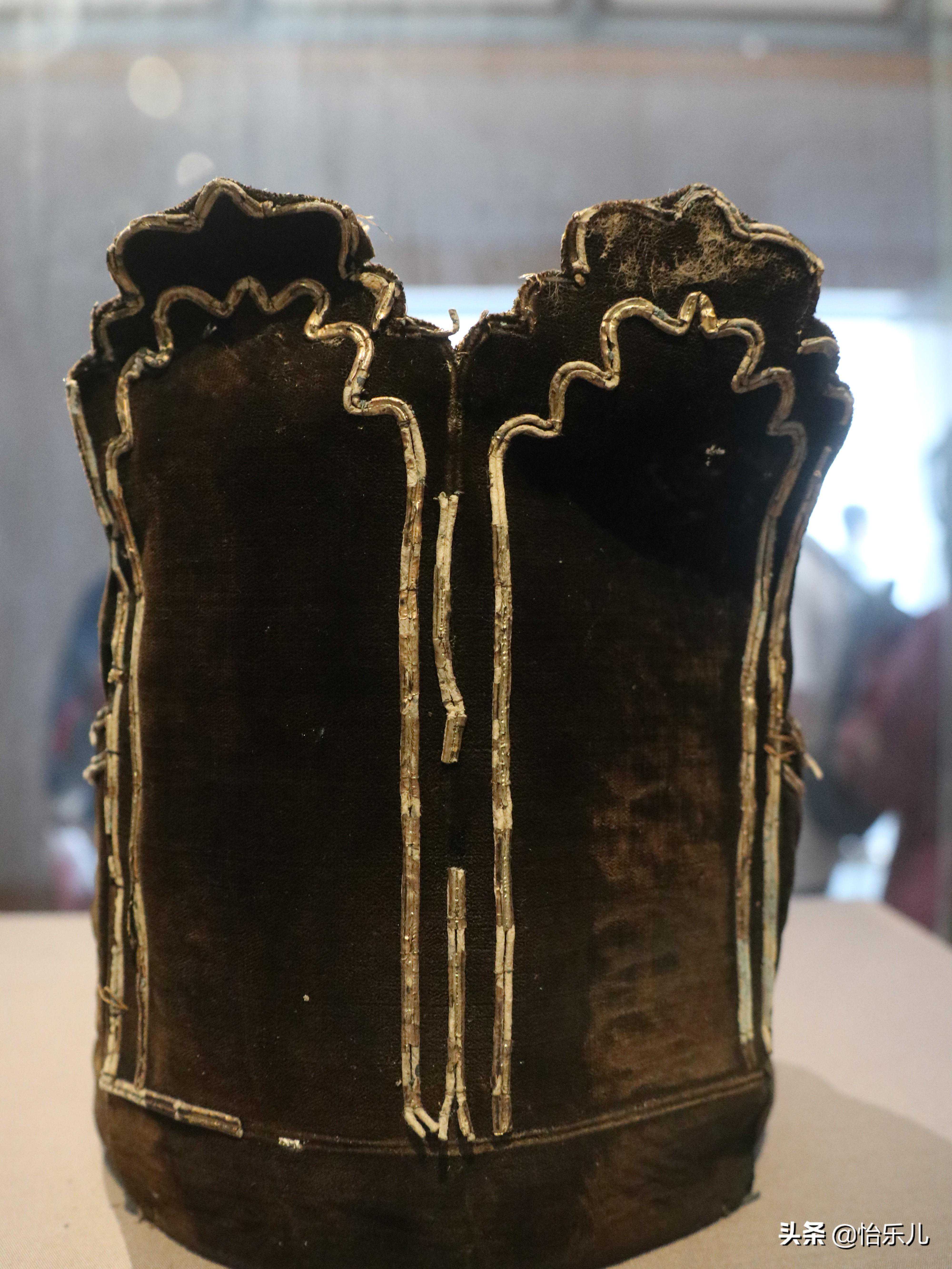 黑素绒面,麻布里,冠上五道梁及如意纹,以金线压锋。