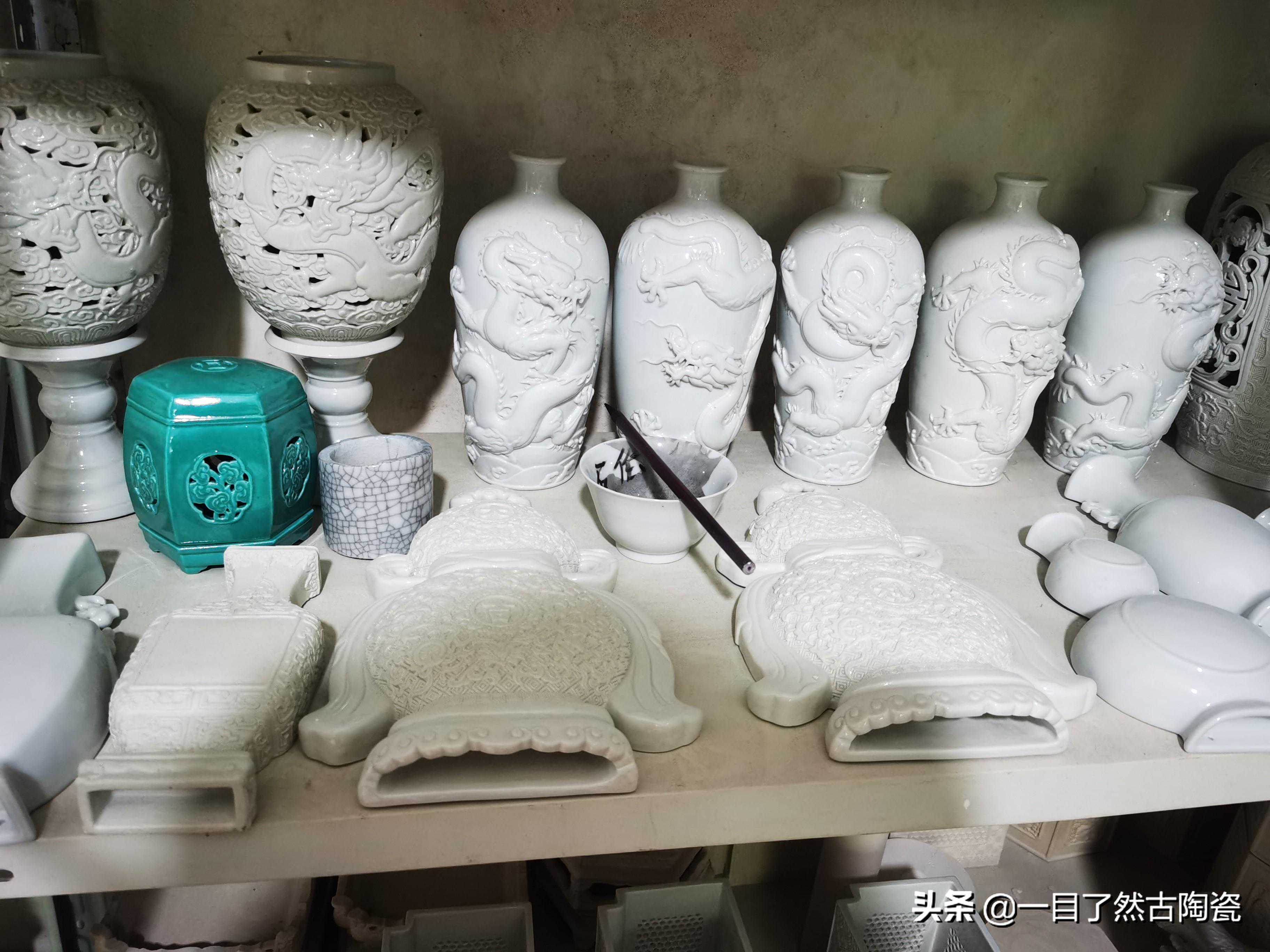 壁瓶的制作:主要是模具定型,风干缩水后脱模,再进行修雕及绘制,最后放在支钉上烧制。